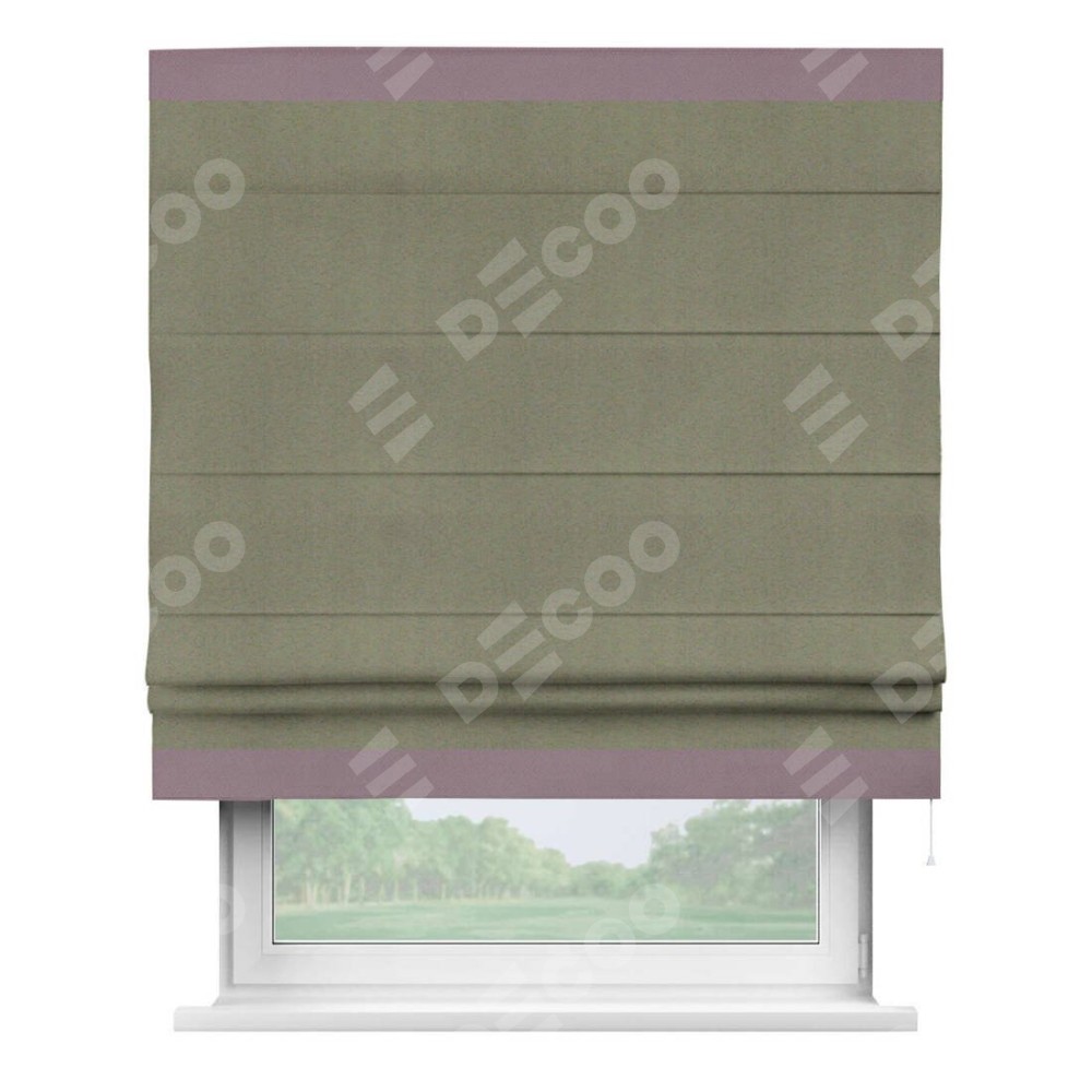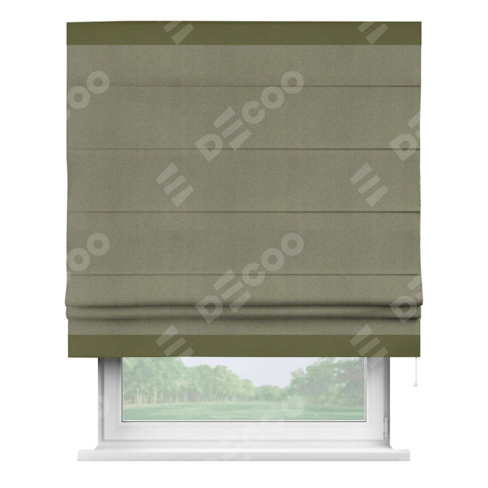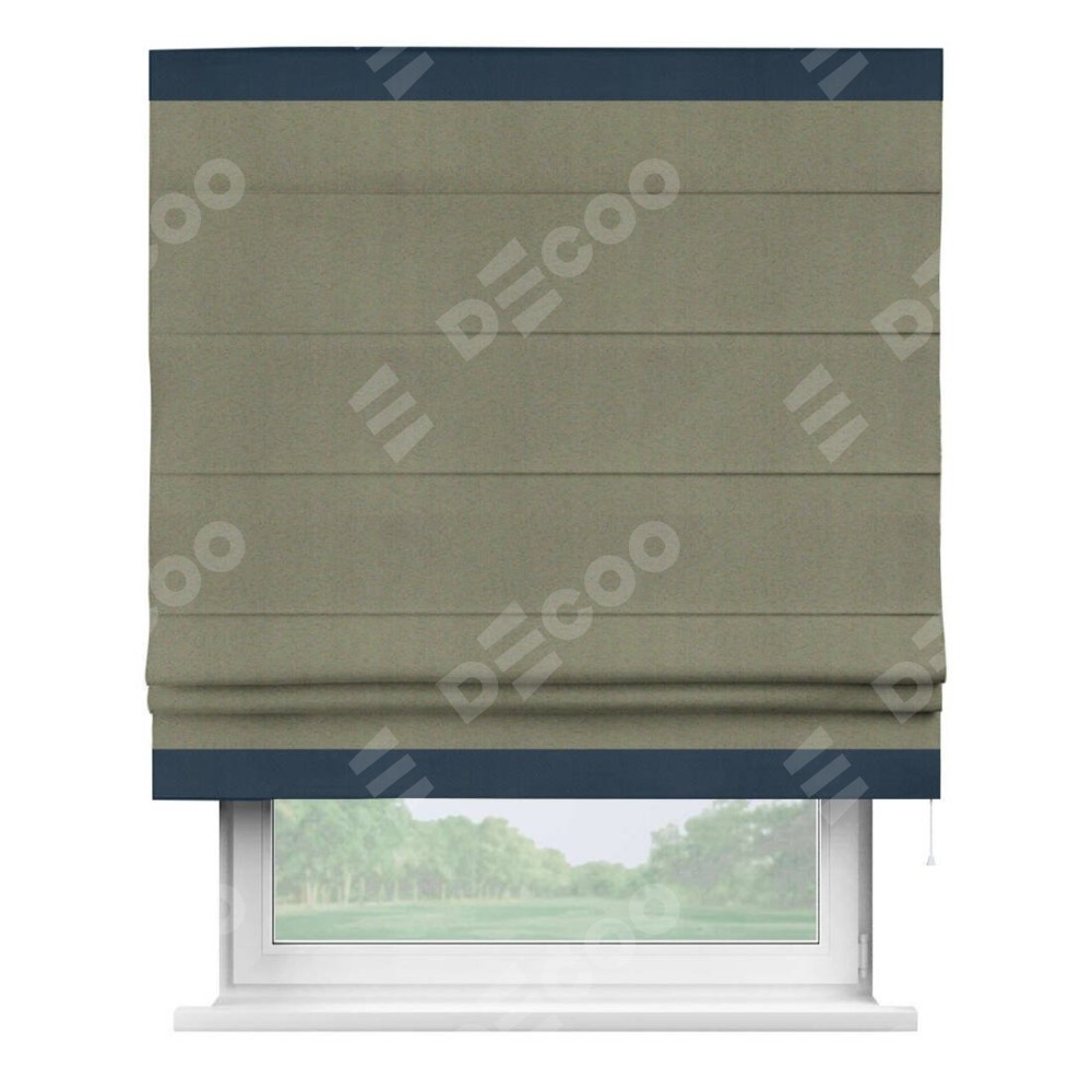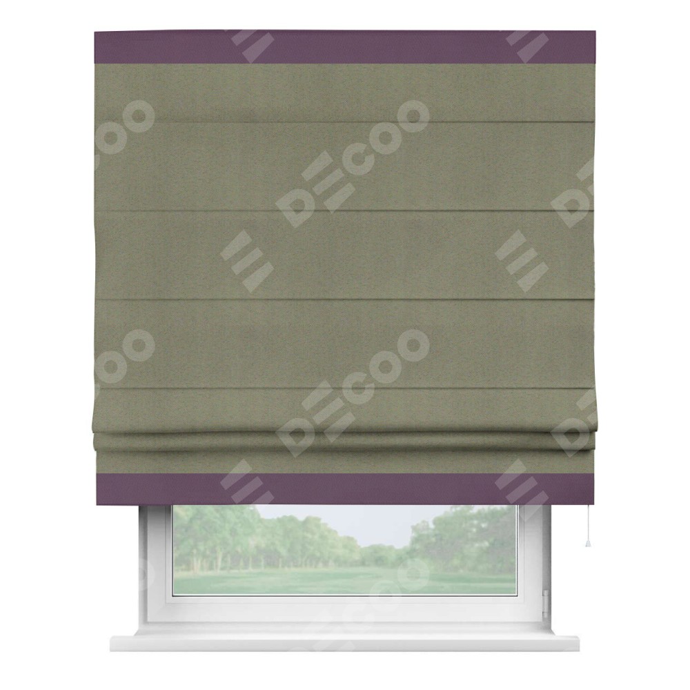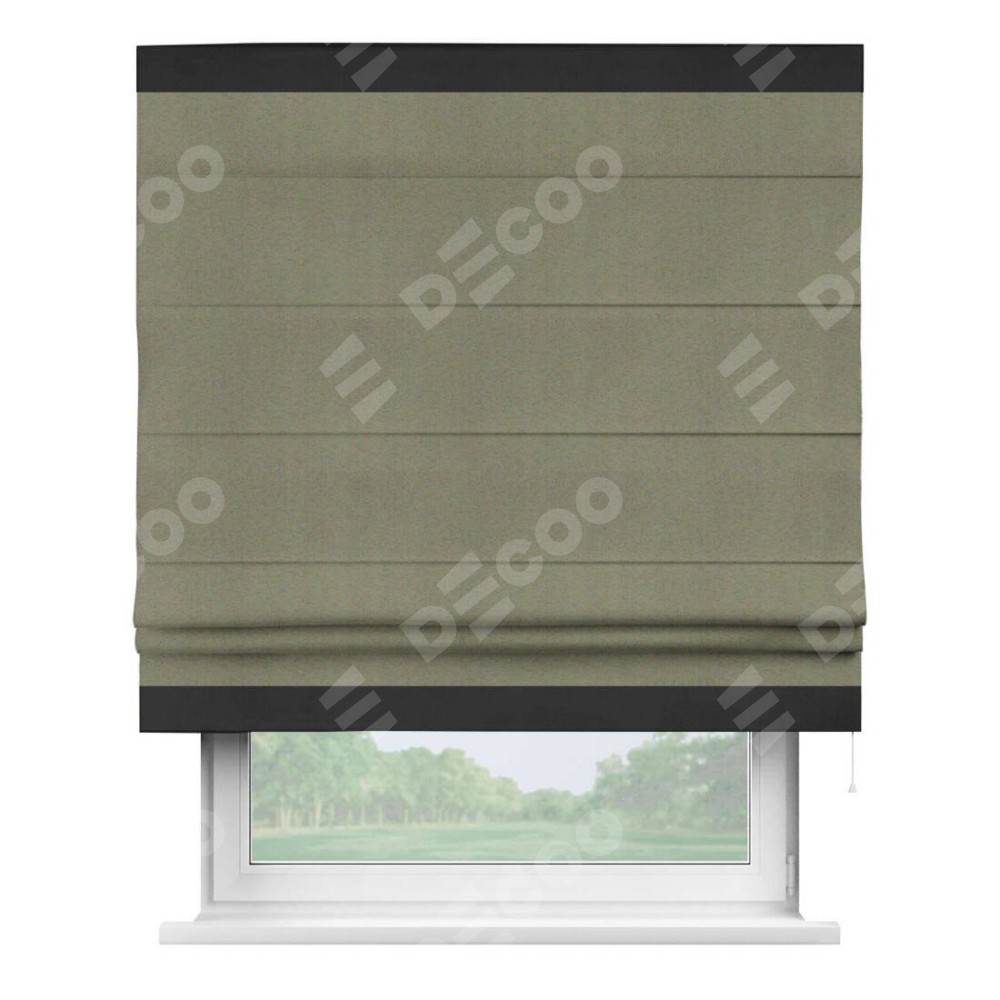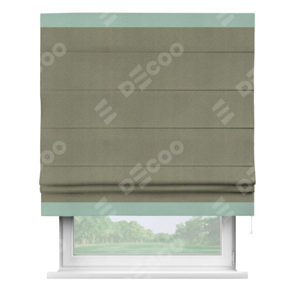 Римская штора производителя «Cortin», используется для проёма, пошита из ткани блэкаут однотонный серо-коричневый, артикул ткани 29568. Отделка шторы кантом «Горизонт», ткань для канта используется из блэкаута однотонного разной расцветки на выбор. Имеет универсальный механизм и подходит для монтажа: на потолок, на стену и в нишу.