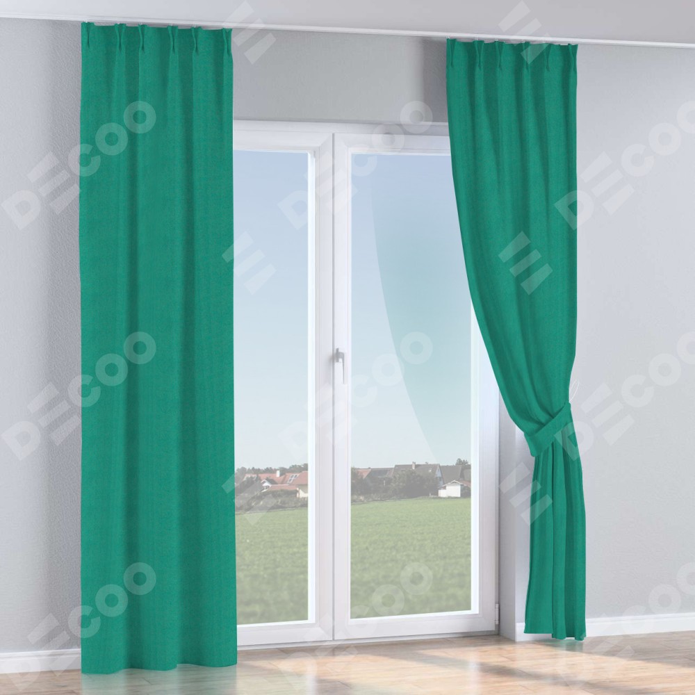 Комплект прямых штор, от производителя «Cortin», пошиты из ткани блэкаут с блеском изумрудный, артикул ткани 34628. С изнаночной стороны в верхней части штор пристрачивается шторная лента с декоративными складками «Кустик». Обратная сторона основного материала черного цвета, что обеспечивает необходимую светонепроницаемость. Для создания элегантных складок прямые шторы шьются по стандарту с коэффициентом 1:2 (на 100 см. ширины проёма 200 см. ширины ткани).