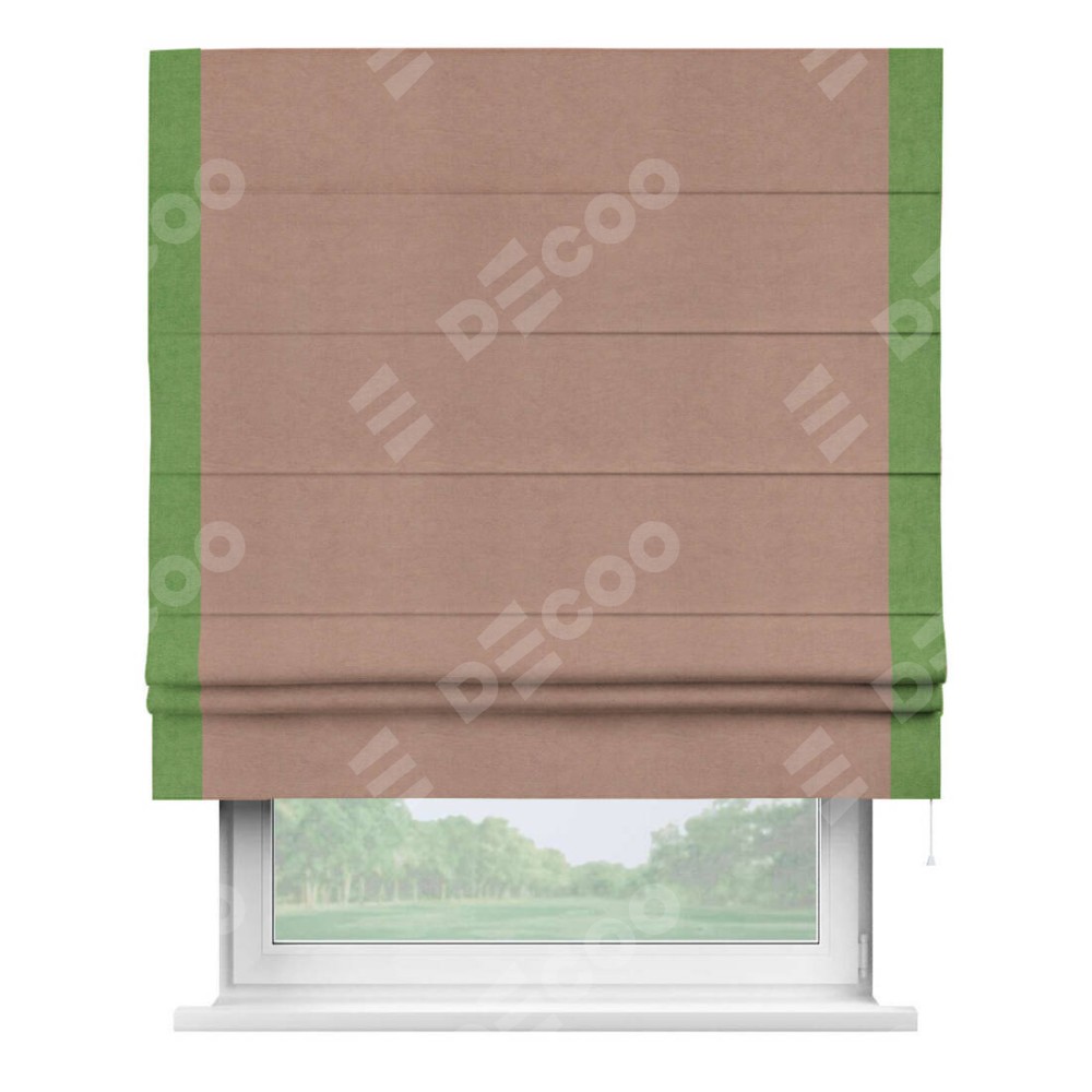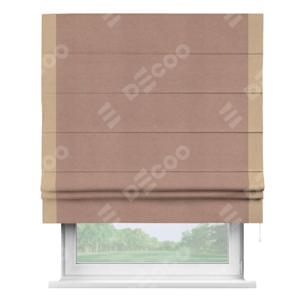 Римская штора производителя «Cortin», используется для проёма, пошита из ткани вельвет брусничный джем, артикул ткани 17750. Отделка шторы кантом «Стрим Дуо», ткань для канта используется из вельвета разной расцветки на выбор. Имеет универсальный механизм и подходит для монтажа: на потолок, на стену и в нишу.