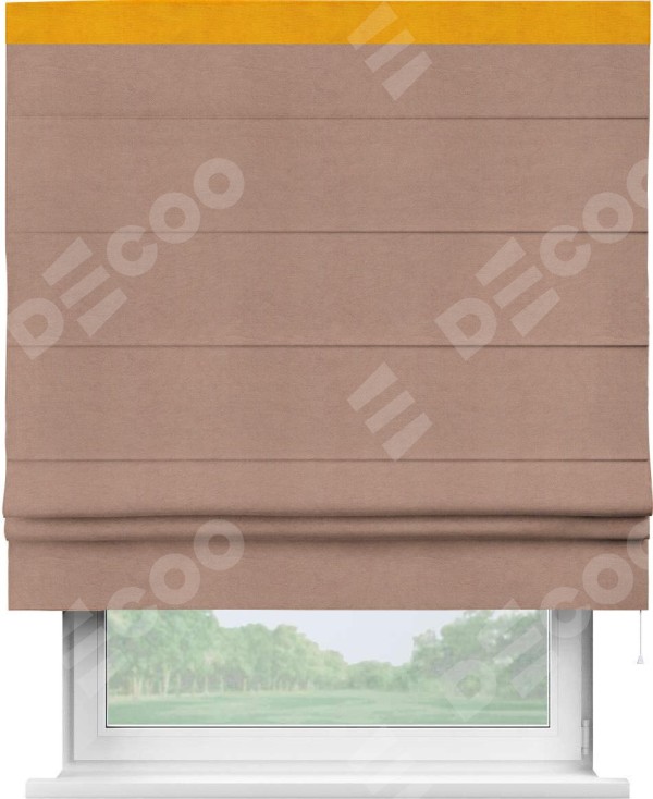 Римская штора производителя «Cortin», используется для проёма, пошита из ткани вельвет брусничный джем, артикул ткани 17750. Отделка шторы кантом «Кинг», ткань для канта используется из вельвета разной расцветки на выбор. Имеет универсальный механизм и подходит для монтажа: на потолок, на стену и в нишу.