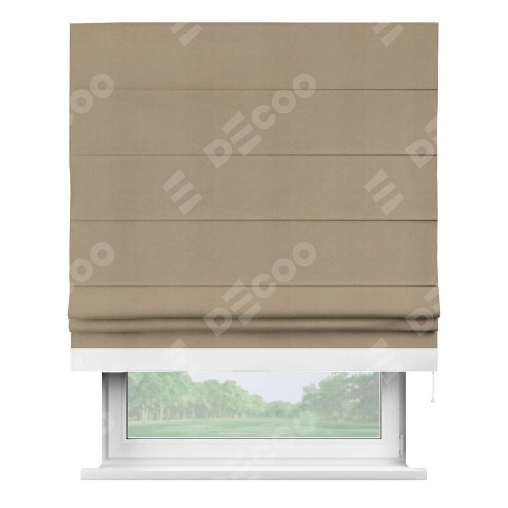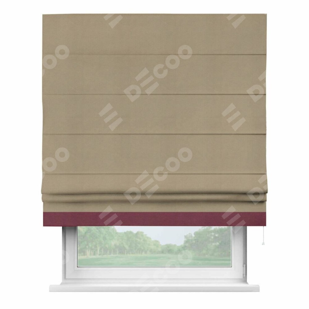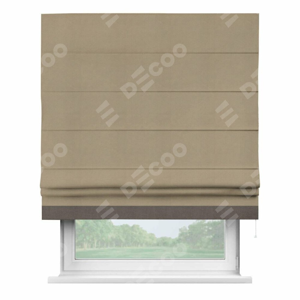 Римская штора производителя «Cortin», используется для проёма, пошита из ткани вельвет кофейный, артикул ткани 30980. Отделка шторы кантом «Джестер», ткань для канта используется из вельвета разной расцветки на выбор. Имеет универсальный механизм и подходит для монтажа: на потолок, на стену и в нишу.