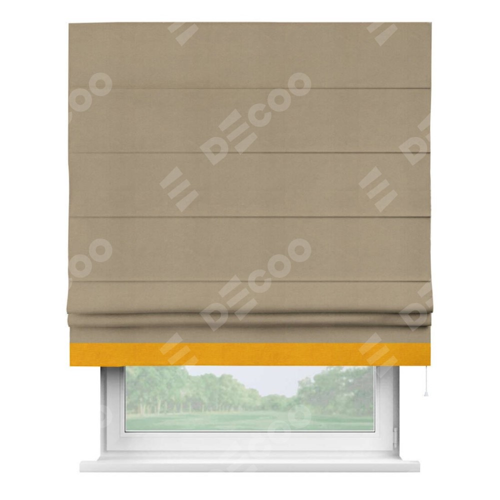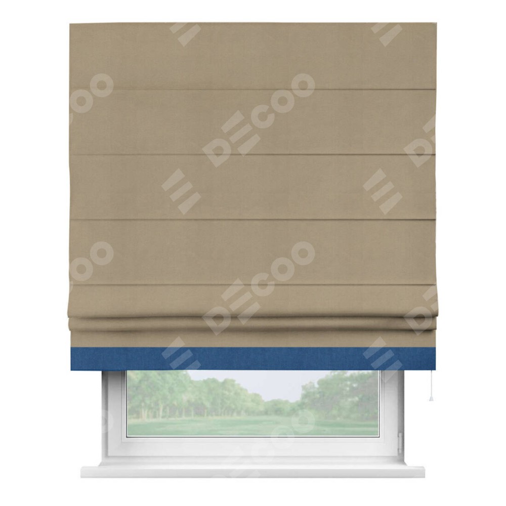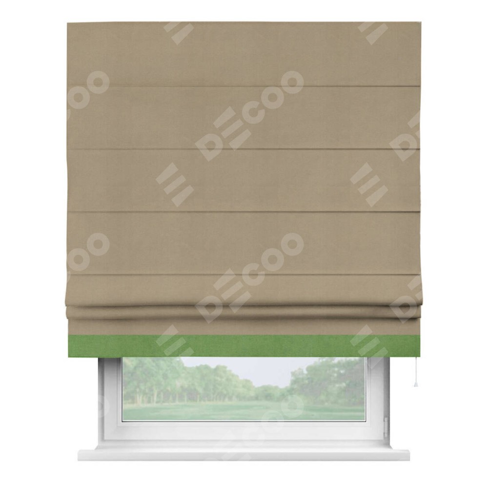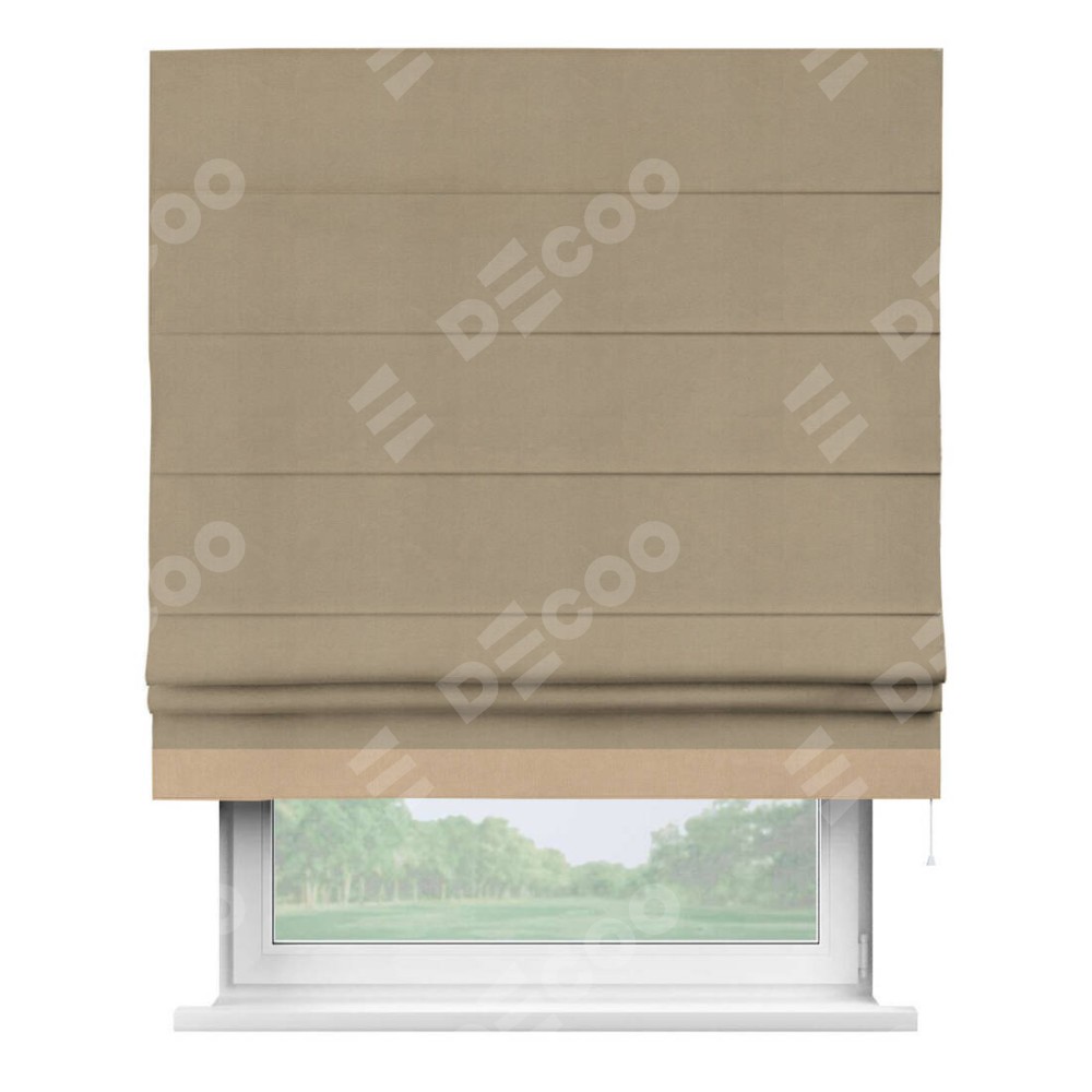 Римская штора производителя «Cortin», используется для проёма, пошита из ткани вельвет кофейный, артикул ткани 30980. Отделка шторы кантом «Джестер», ткань для канта используется из вельвета разной расцветки на выбор. Имеет универсальный механизм и подходит для монтажа: на потолок, на стену и в нишу.