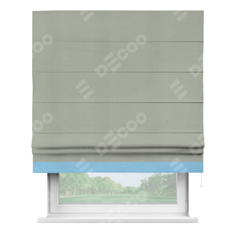 Римская штора производителя «Cortin», используется для проёма, пошита из ткани вельвет светло-серый, артикул ткани 30981. Отделка шторы кантом «Джестер», ткань для канта используется из вельвета разной расцветки на выбор. Имеет универсальный механизм и подходит для монтажа: на потолок, на стену и в нишу.