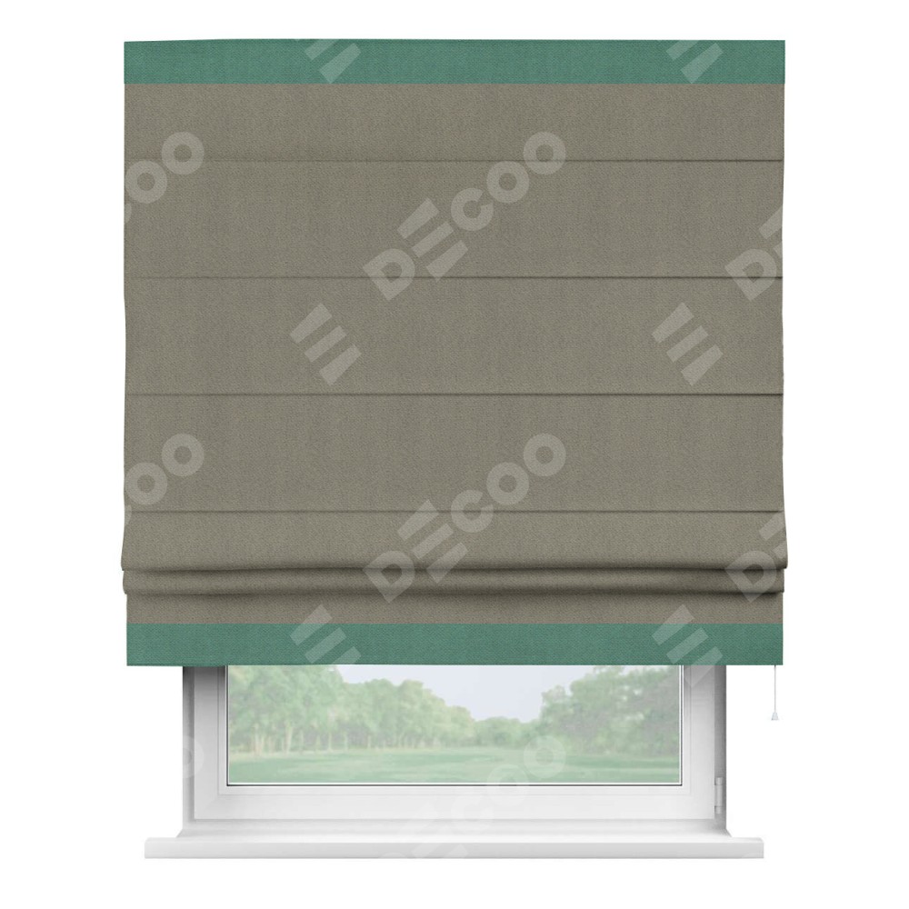 Римская штора производителя «Cortin», используется для проёма, пошита из ткани блэкаут с блеском графитовый, артикул 34648. Отделка шторы кантом «Горизонт», ткань для канта используется из блэкаута с блеском разной расцветки на выбор. Изнаночная сторона материала черного цвета, что обеспечивает необходимую светонепроницаемость. Имеет универсальный механизм и подходит для монтажа: на потолок, на стену и в нишу.