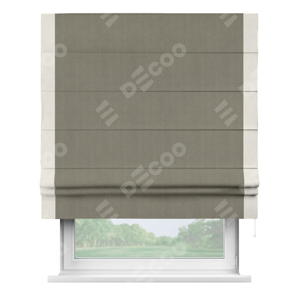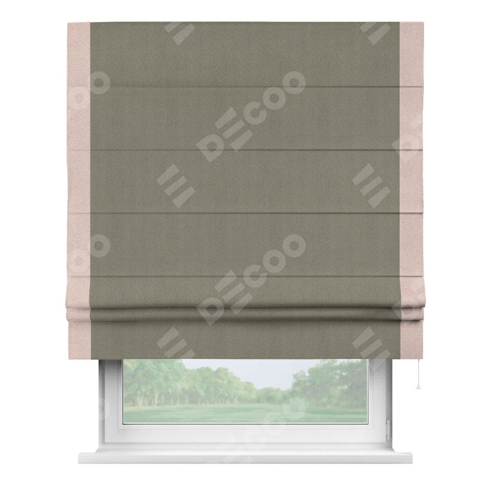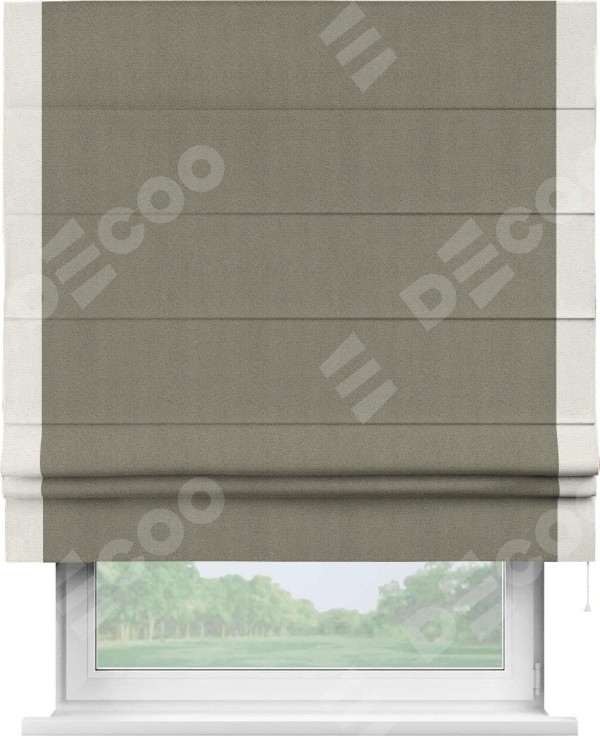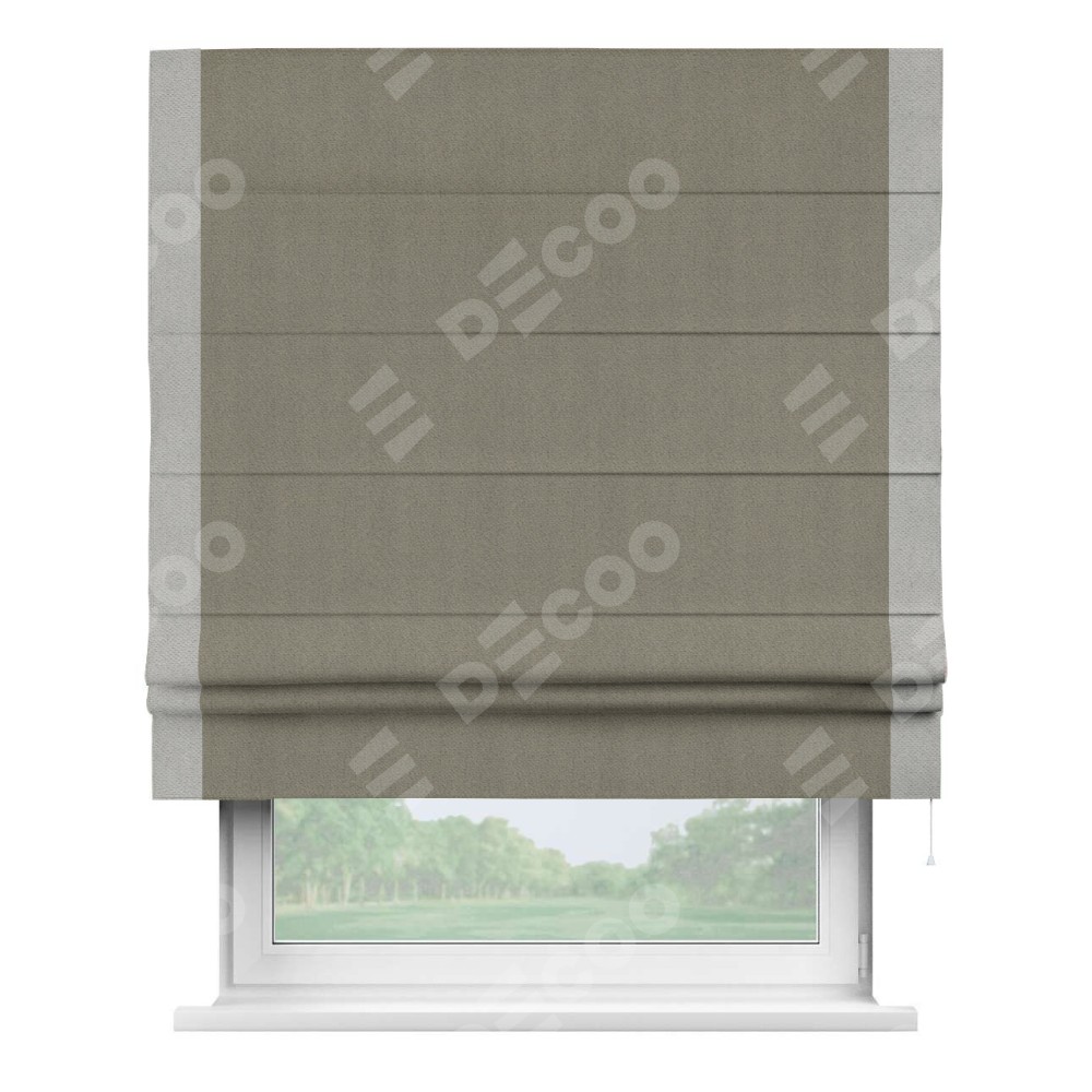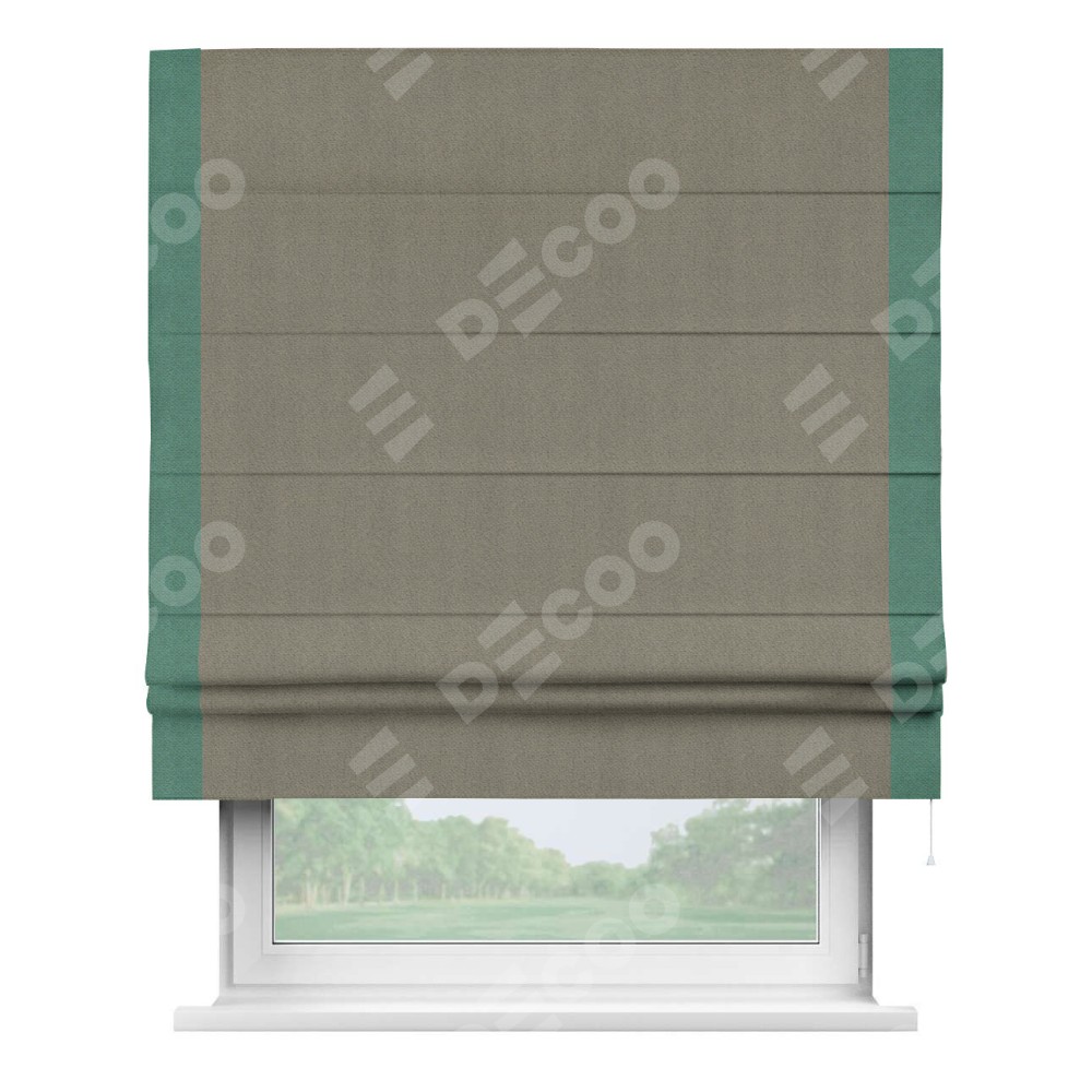 Римская штора производителя «Cortin», используется для проёма, пошита из ткани блэкаут с блеском графитовый, артикул 34648. Отделка шторы кантом «Стрим Дуо», ткань для канта используется из блэкаута с блеском разной расцветки на выбор. Изнаночная сторона материала черного цвета, что обеспечивает необходимую светонепроницаемость. Имеет универсальный механизм и подходит для монтажа: на потолок, на стену и в нишу.