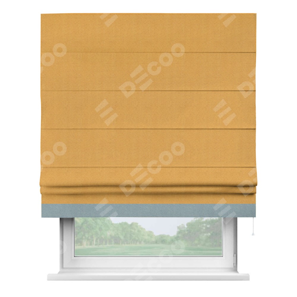 Римская штора производителя «Cortin», используется для проёма, пошита из ткани блэкаут с блеском золотой, артикул 34626. Отделка шторы кантом «Джестер», ткань для канта используется из блэкаута с блеском разной расцветки на выбор. Изнаночная сторона материала черного цвета, что обеспечивает необходимую светонепроницаемость. Имеет универсальный механизм и подходит для монтажа: на потолок, на стену и в нишу.