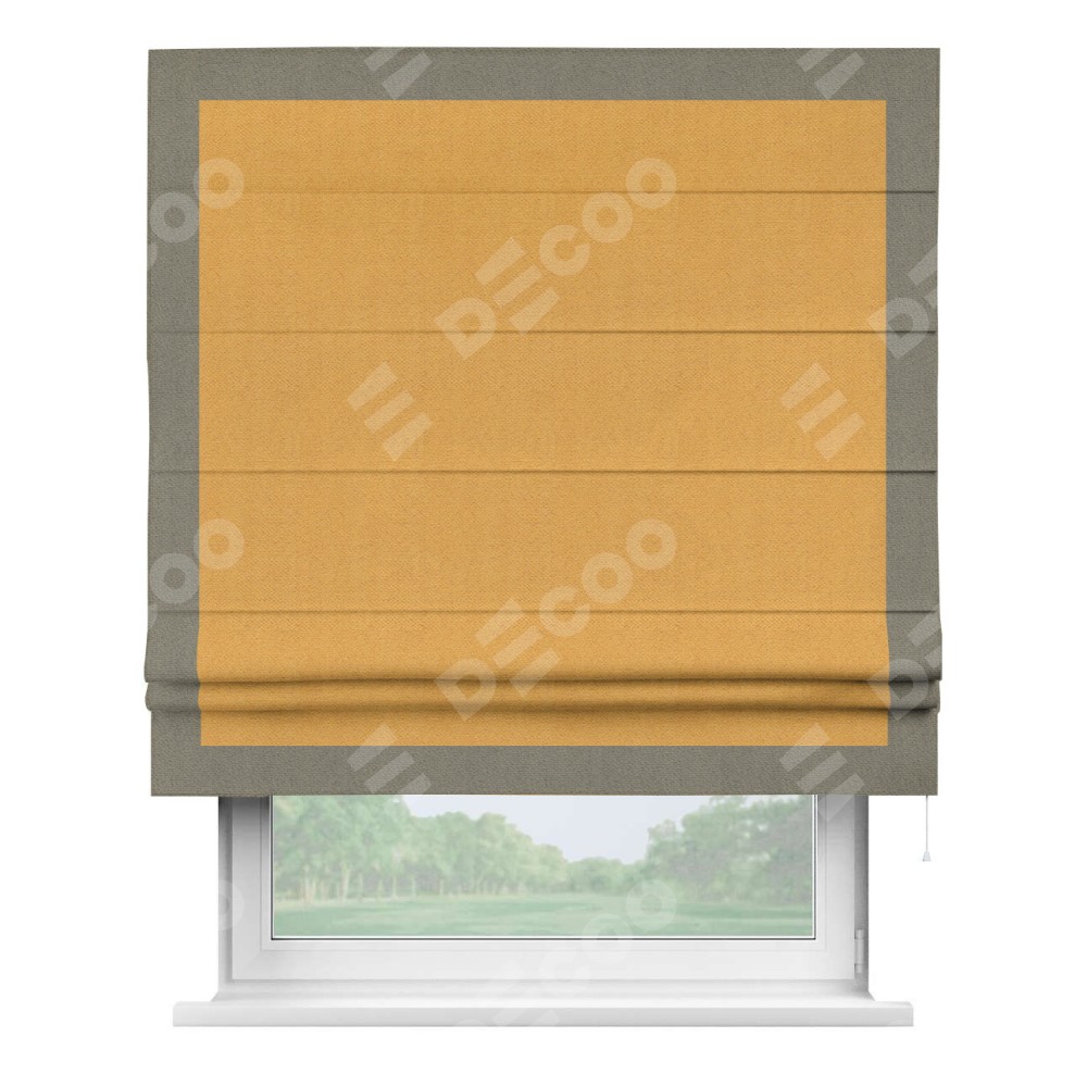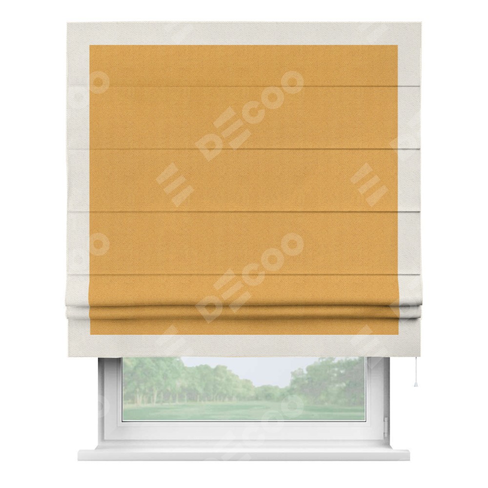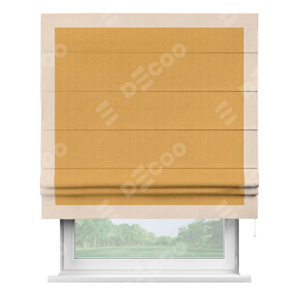 Римская штора производителя «Cortin», используется для проёма, пошита из ткани блэкаут с блеском золотой, артикул 34626. Отделка шторы кантом «Чесс», ткань для канта используется из блэкаута с блеском разной расцветки на выбор. Изнаночная сторона материала черного цвета, что обеспечивает необходимую светонепроницаемость. Имеет универсальный механизм и подходит для монтажа: на потолок, на стену и в нишу.