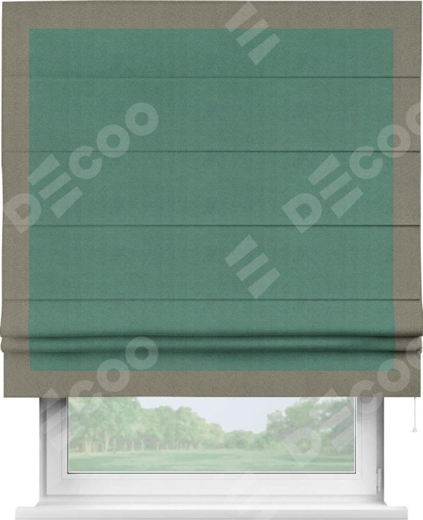 Римская штора производителя «Cortin», используется для проёма, пошита из ткани блэкаут с блеском изумрудный, артикул 34628. Отделка шторы кантом «Чесс», ткань для канта используется из блэкаута с блеском разной расцветки на выбор. Изнаночная сторона материала черного цвета, что обеспечивает необходимую светонепроницаемость. Имеет универсальный механизм и подходит для монтажа: на потолок, на стену и в нишу.