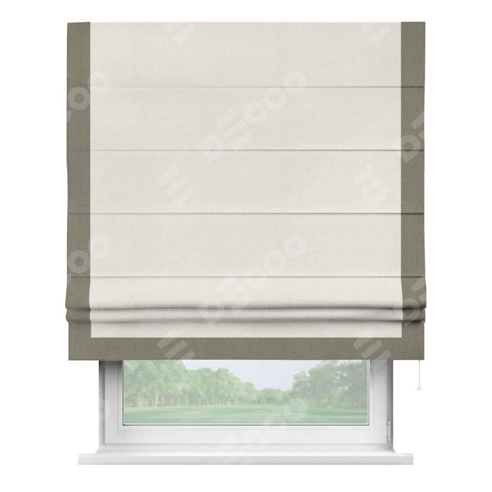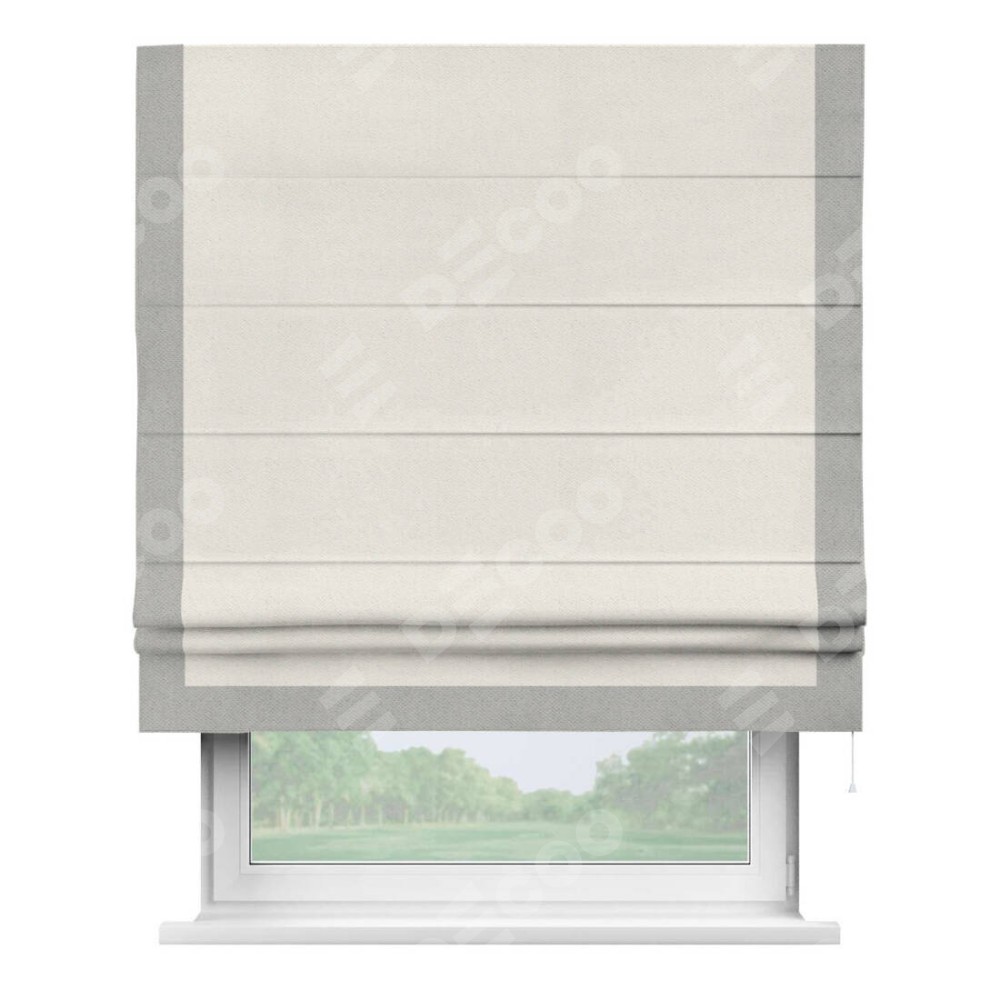 Римская штора производителя «Cortin», используется для проёма, пошита из ткани блэкаут с блеском светло-серый, артикул 34633. Отделка шторы кантом «Виктория», ткань для канта используется из блэкаута с блеском разной расцветки на выбор. Изнаночная сторона материала черного цвета, что обеспечивает необходимую светонепроницаемость. Имеет универсальный механизм и подходит для монтажа: на потолок, на стену и в нишу.