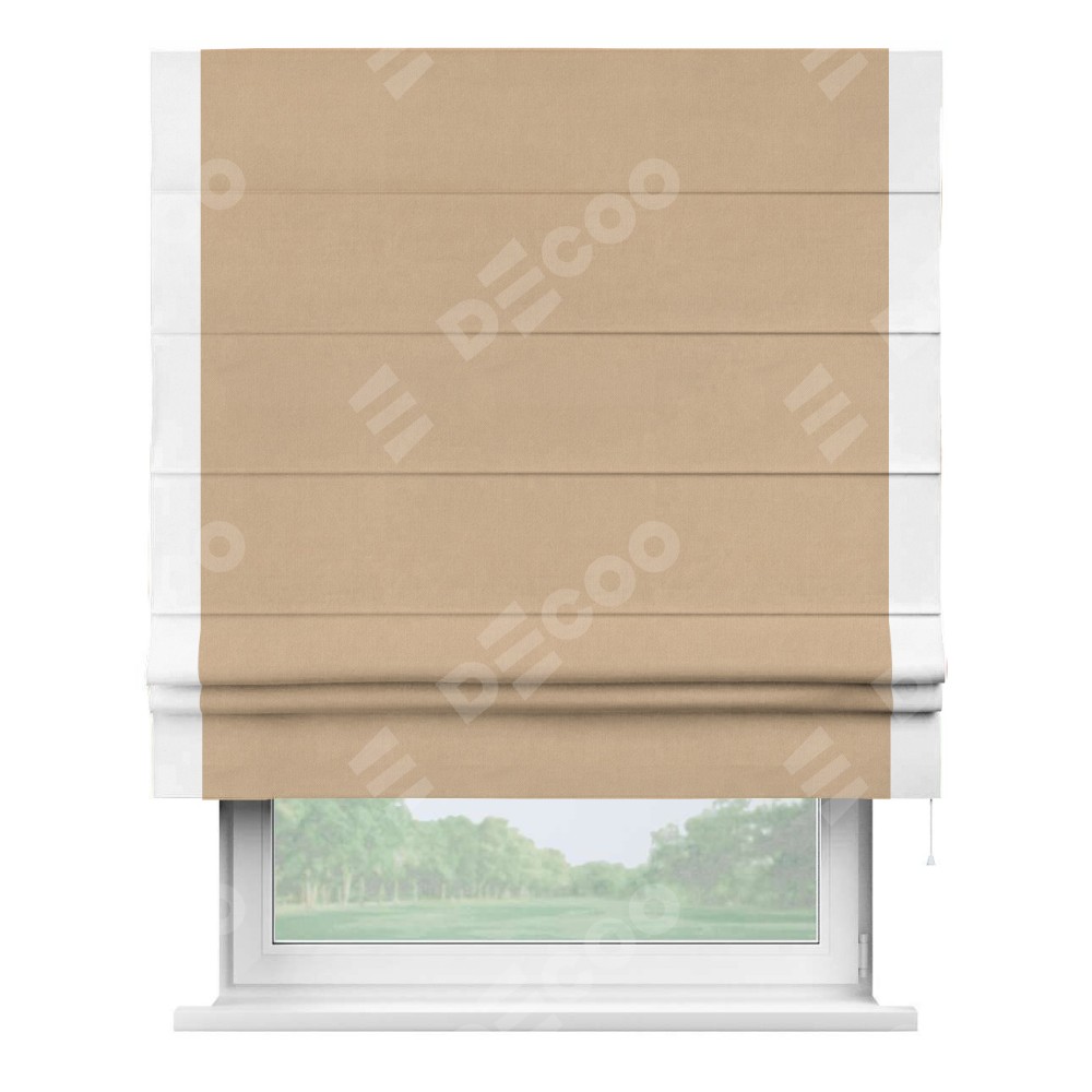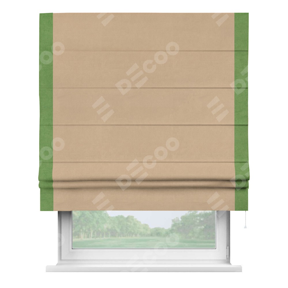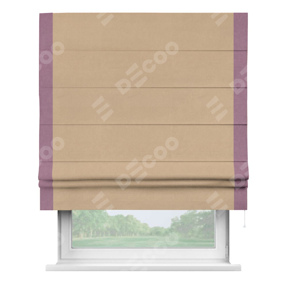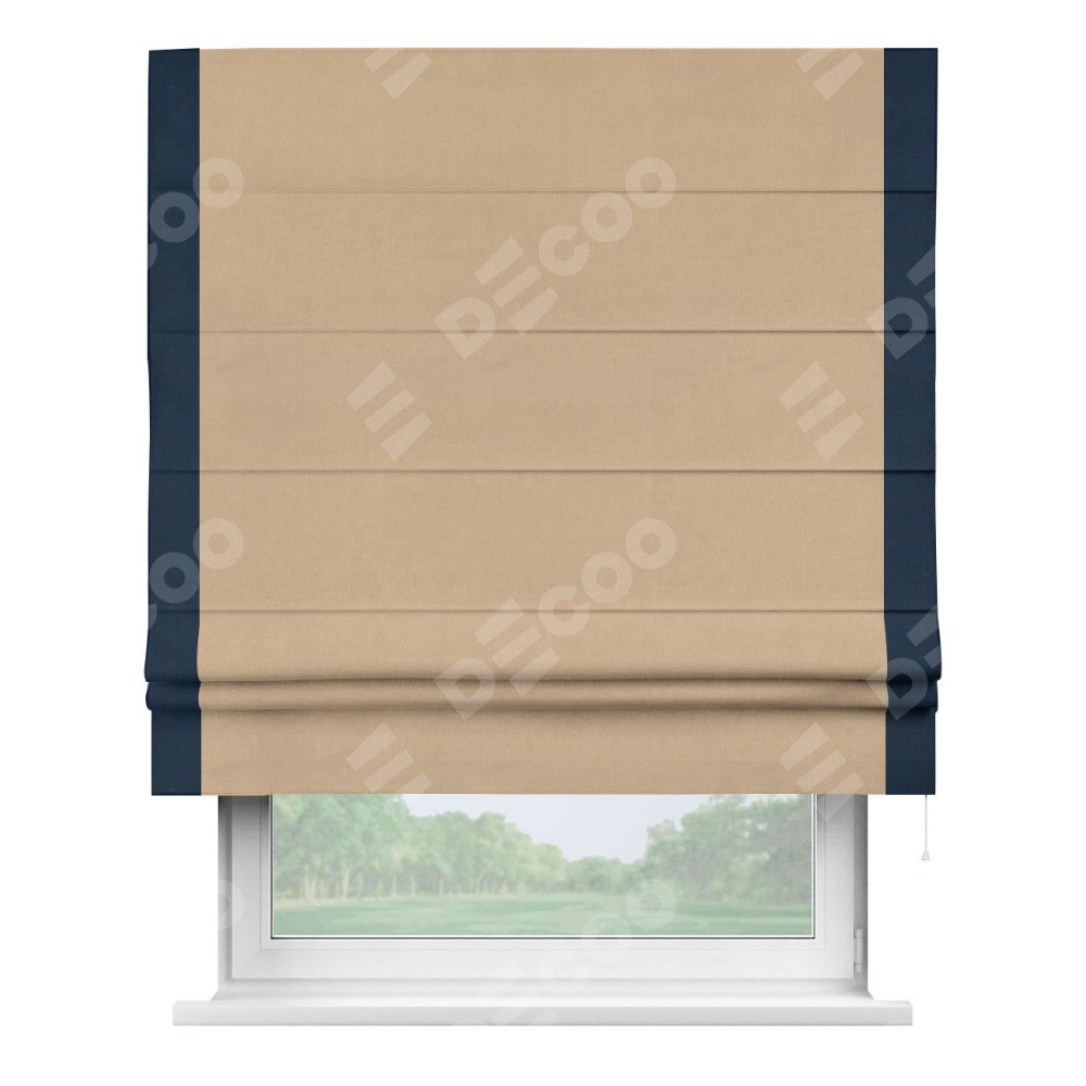Римская штора производителя «Cortin», используется для проёма, пошита из ткани вельвет песочный, артикул ткани 17740. Отделка шторы кантом «Стрим Дуо», ткань для канта используется из вельвета разной расцветки на выбор. Имеет универсальный механизм и подходит для монтажа: на потолок, на стену и в нишу.