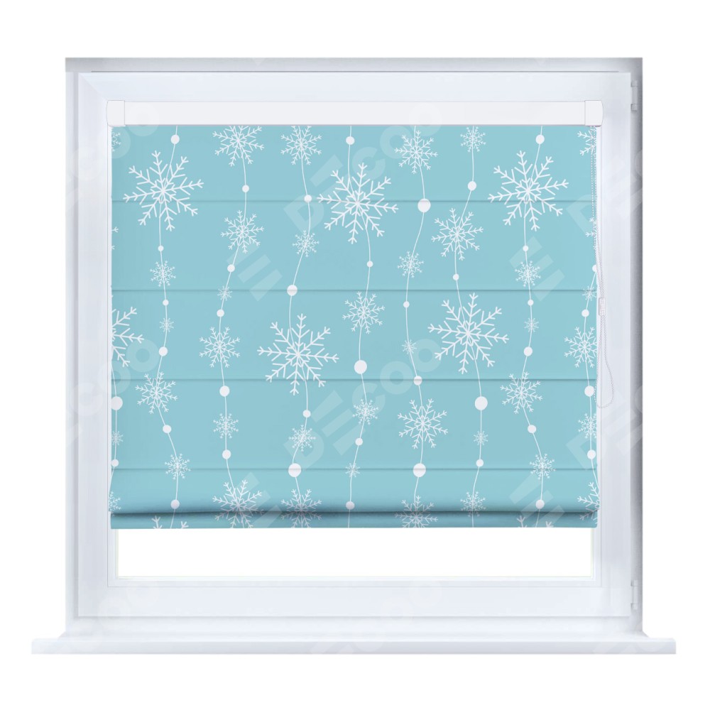 Римская штора производителя «Cortin», устанавливается на створку окна, пошита из ткани блэкаут с нанесением сублимационной печати «Гирлянда из снежинок». Штора шьётся по индивидуальным размерам, для данного типа римской шторы возможная ширина от 35 до 150 см., высота до 250 см.