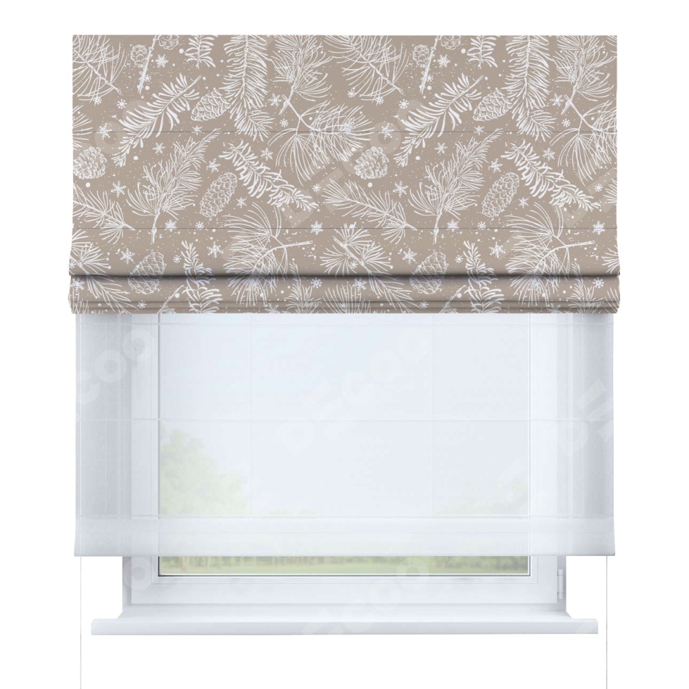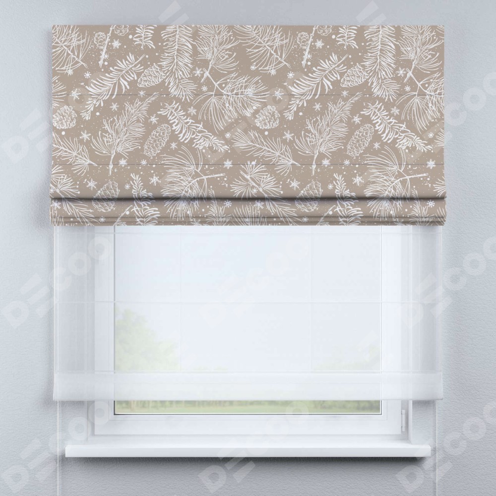 Римская штора день-ночь производителя «Cortin», используется для проёма, пошита из двух полотен, с лицевой блэкаут с нанесением сублимационной печати «Заснеженный лес», вторая ткань тюль (по стандарту комплектуется тюль белого цвета артикул V-01). Имеет универсальный механизм и подходит для монтажа: на потолок, на стену и в нишу.