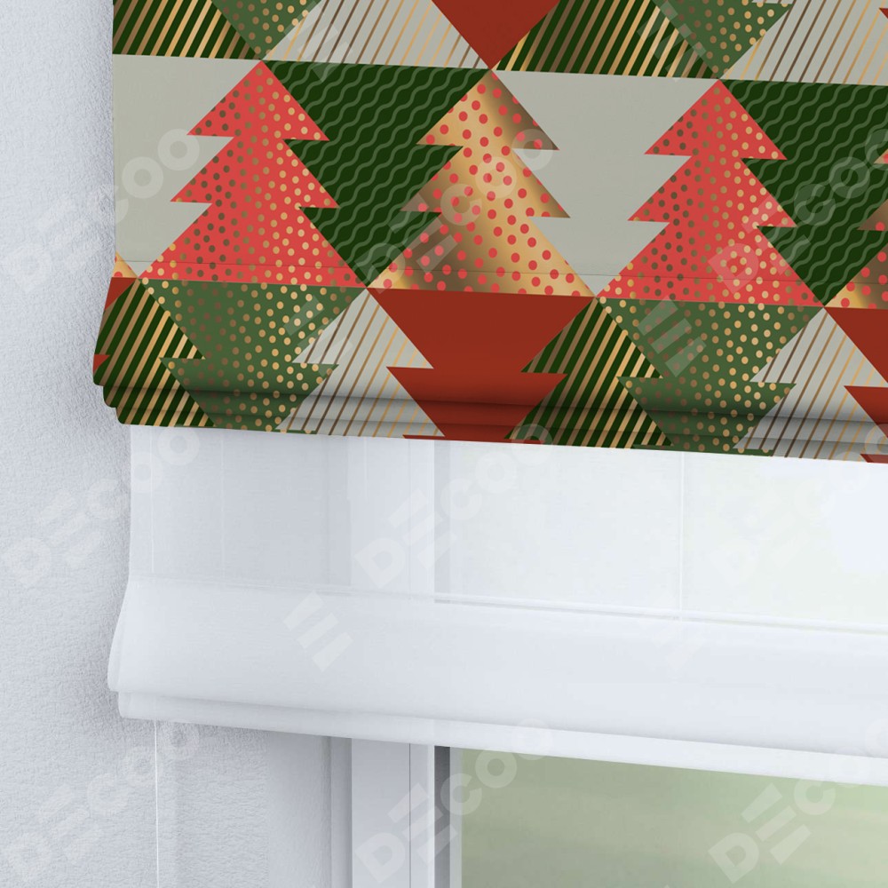 Римская штора день-ночь производителя «Cortin», используется для проёма, пошита из двух полотен, с лицевой блэкаут с нанесением сублимационной печати «Новогоднее украшение», вторая ткань тюль (по стандарту комплектуется тюль белого цвета артикул V-01). Имеет универсальный механизм и подходит для монтажа: на потолок, на стену и в нишу.