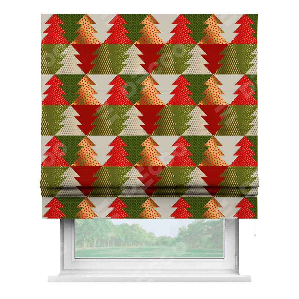 Римская штора производителя «Cortin», используется для проёма, пошита из ткани блэкаут с нанесением сублимационной печати «Новогоднее украшение». Имеет универсальный механизм и подходит для монтажа: на потолок, на стену и в нишу.