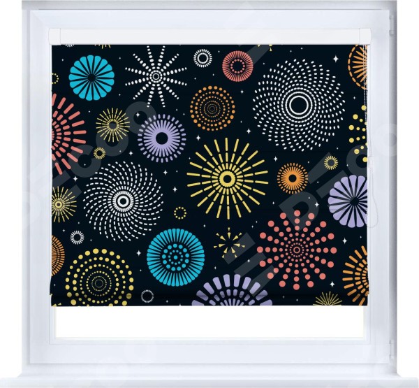 Римская штора производителя «Cortin», устанавливается на створку окна, пошита из ткани блэкаут с нанесением сублимационной печати «Праздничный фейерверк». Штора шьётся по индивидуальным размерам, для данного типа римской шторы возможная ширина от 35 до 150 см., высота до 250 см.