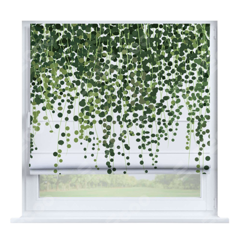Римская штора производителя «Cortin», устанавливается на створку окна, пошита из ткани блэкаут с нанесением сублимационной печати «Зелёный занавес». Штора шьётся по индивидуальным размерам, для данного типа римской шторы возможная ширина от 35 до 150 см., высота до 250 см.