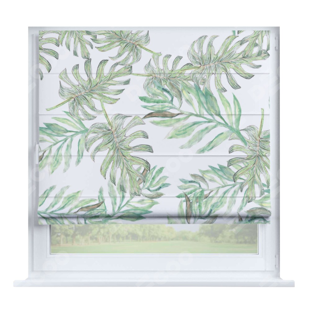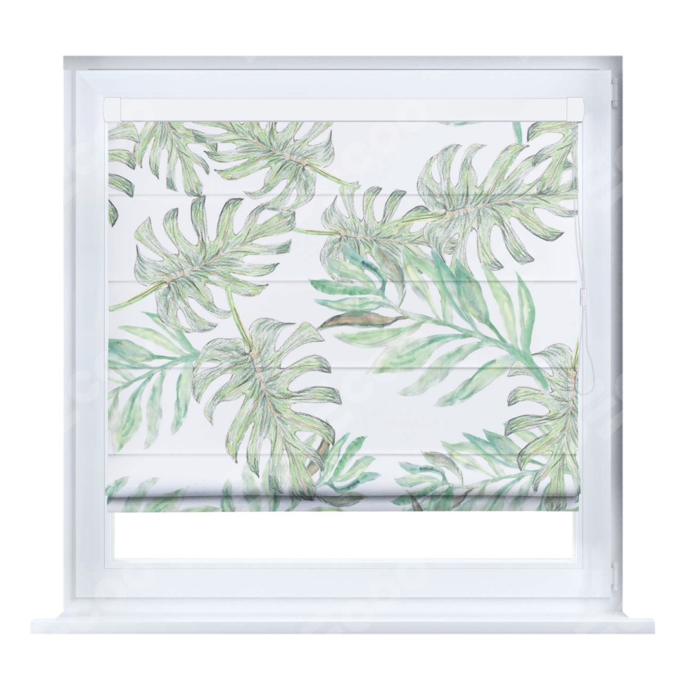 Римская штора производителя «Cortin», устанавливается на створку окна, пошита из ткани блэкаут с нанесением сублимационной печати «Листья монстеры». Штора шьётся по индивидуальным размерам, для данного типа римской шторы возможная ширина от 35 до 150 см., высота до 250 см.