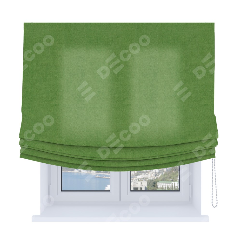 Римская штора Soft производителя «Cortin», используется для проёма, пошита из ткани вельвет салатовый, артикул ткани 87072. Имеет универсальный механизм и подходит для монтажа: на потолок, на стену и в нишу. В отличие от стандартных римских штор, римская штора Soft не имеет горизонтальных вставок и нижнего отвеса. Это позволяет ткани произвольно драпироваться в свободные мягкие складки.