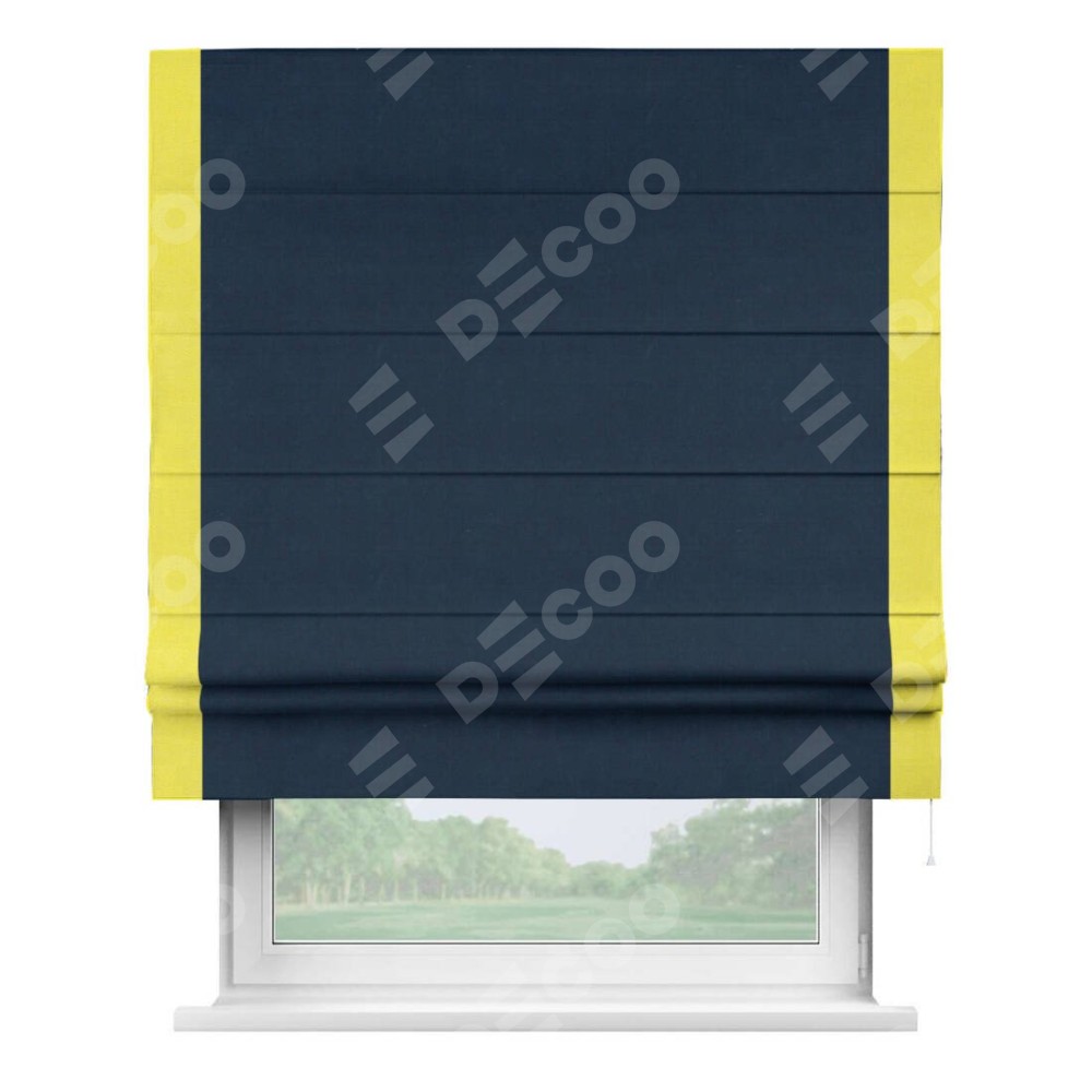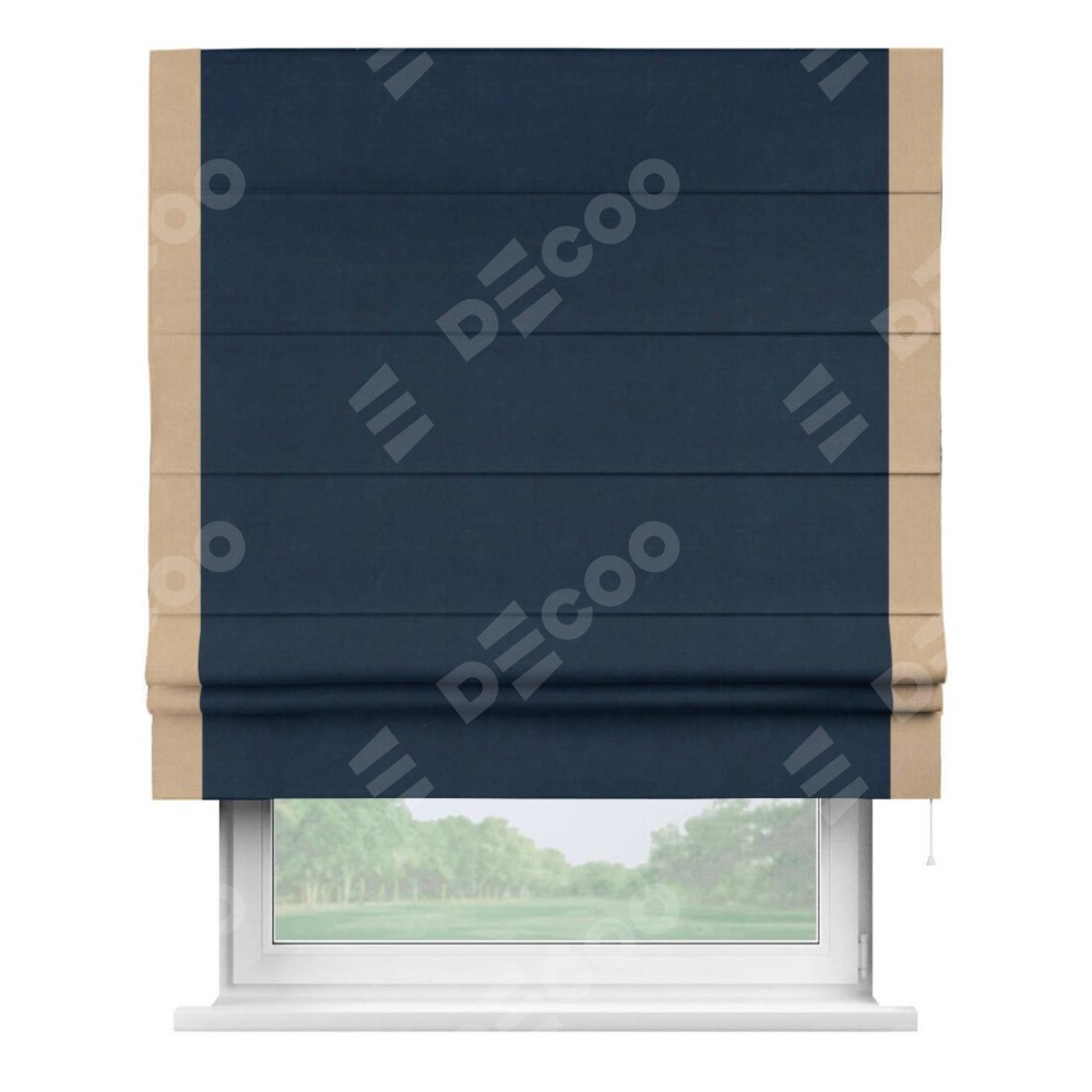 Римская штора производителя «Cortin», используется для проёма, пошита из ткани вельвет темно-синий, артикул ткани 14152. Отделка шторы кантом «Стрим Дуо», ткань для канта используется из вельвета разной расцветки на выбор. Имеет универсальный механизм и подходит для монтажа: на потолок, на стену и в нишу.