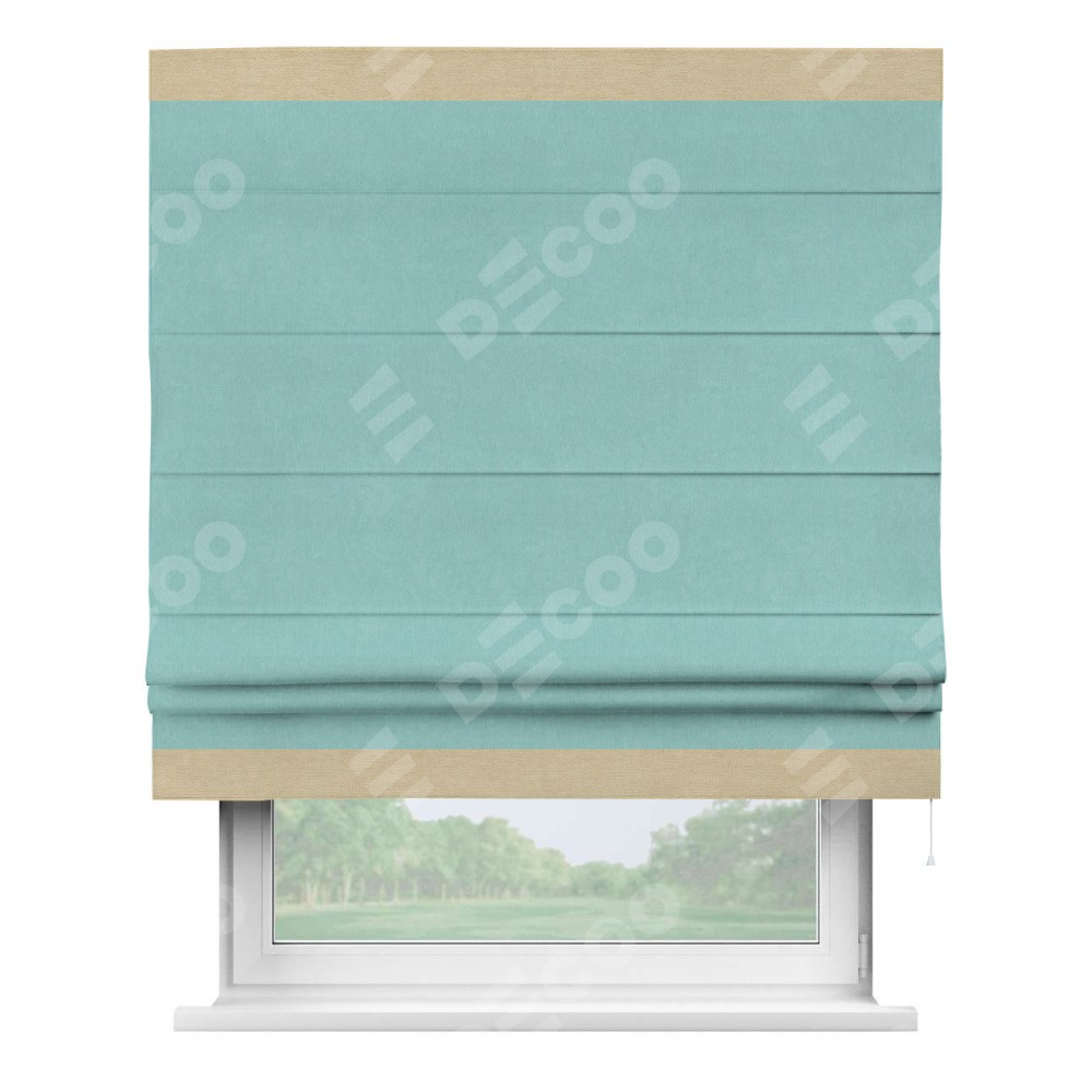 Римская штора производителя «Cortin», используется для проёма, пошита из ткани вельвет тиффани, артикул ткани 17765. Отделка шторы кантом «Горизонт», ткань для канта используется из вельвета разной расцветки на выбор. Имеет универсальный механизм и подходит для монтажа: на потолок, на стену и в нишу.