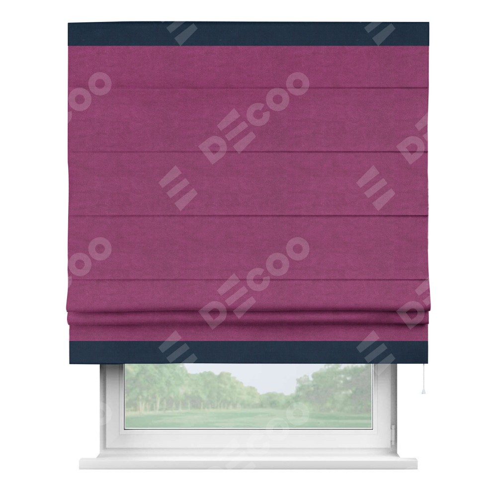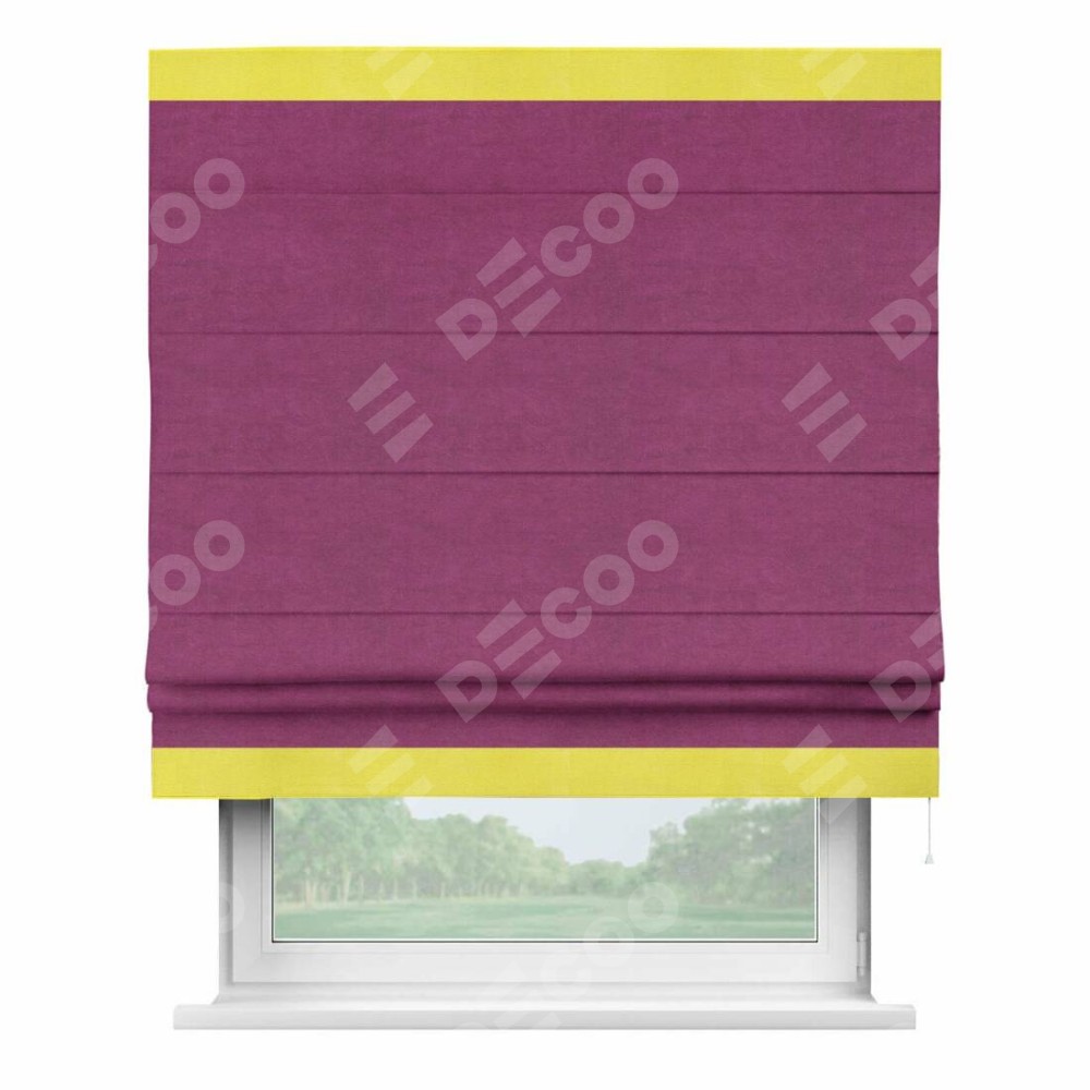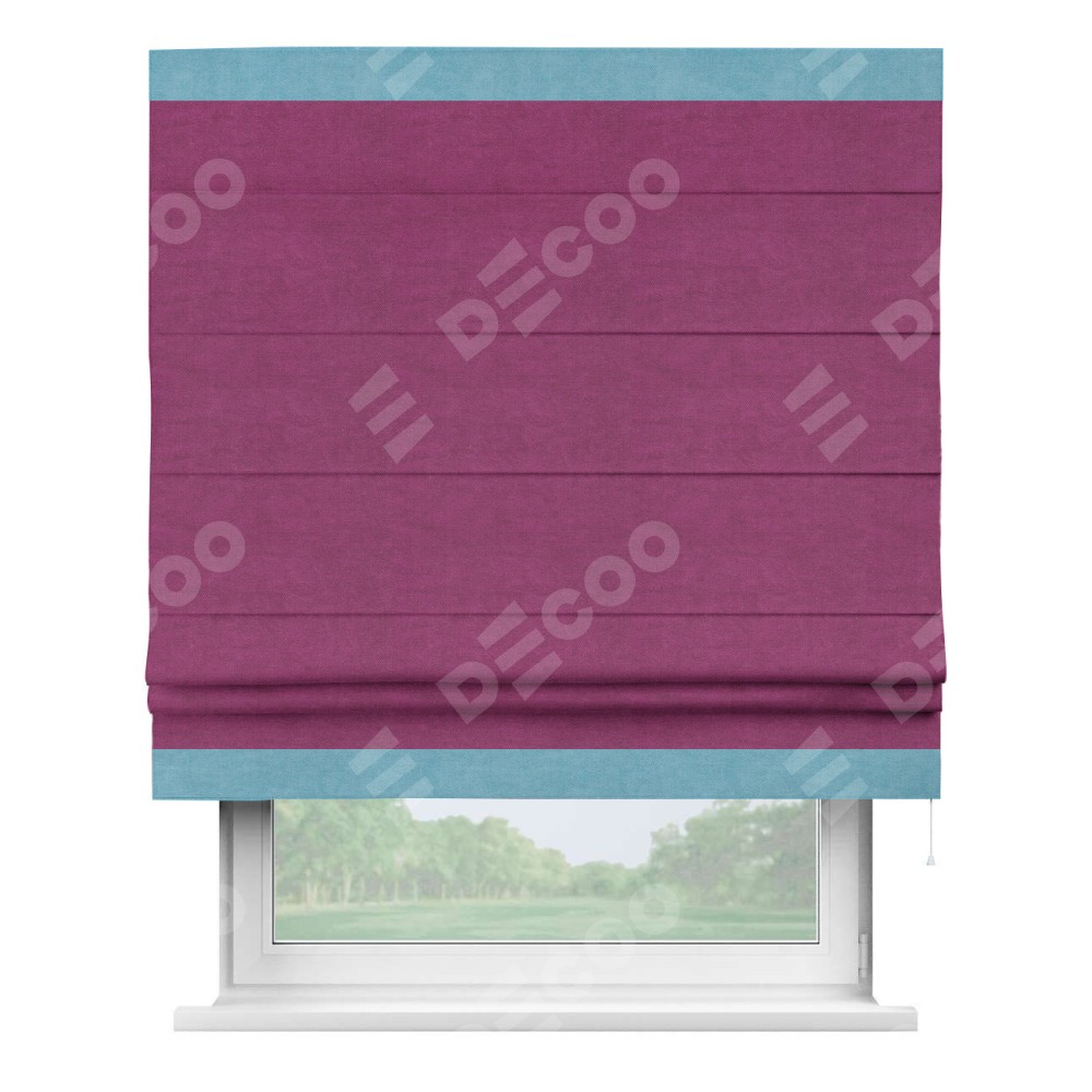 Римская штора производителя «Cortin», используется для проёма, пошита из ткани вельвет фиолетовый, артикул ткани 85552. Отделка шторы кантом «Горизонт», ткань для канта используется из вельвета разной расцветки на выбор. Имеет универсальный механизм и подходит для монтажа: на потолок, на стену и в нишу.