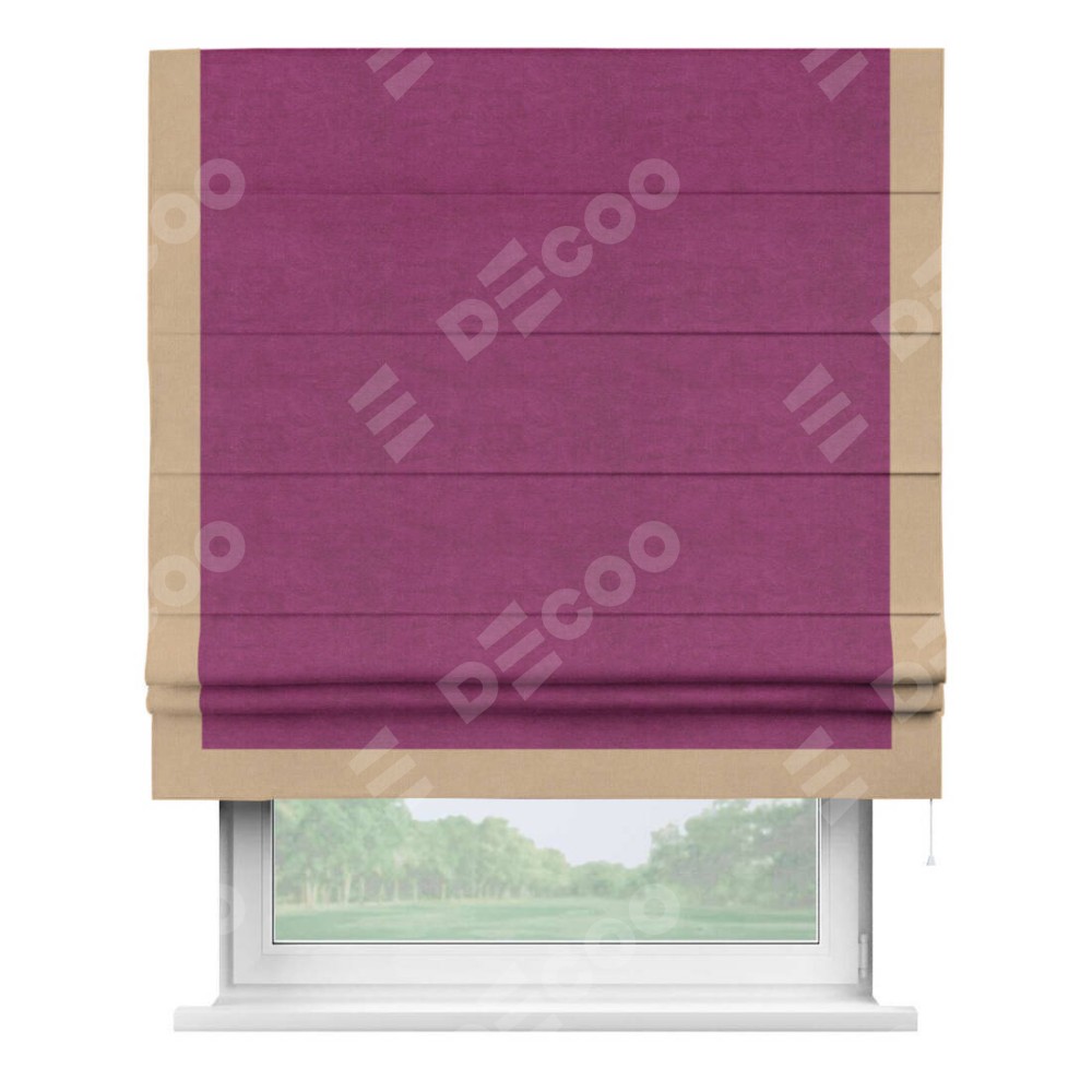 Римская штора производителя «Cortin», используется для проёма, пошита из ткани вельвет фиолетовый, артикул ткани 85552. Отделка шторы кантом «Виктория», ткань для канта используется из вельвета разной расцветки на выбор. Имеет универсальный механизм и подходит для монтажа: на потолок, на стену и в нишу.