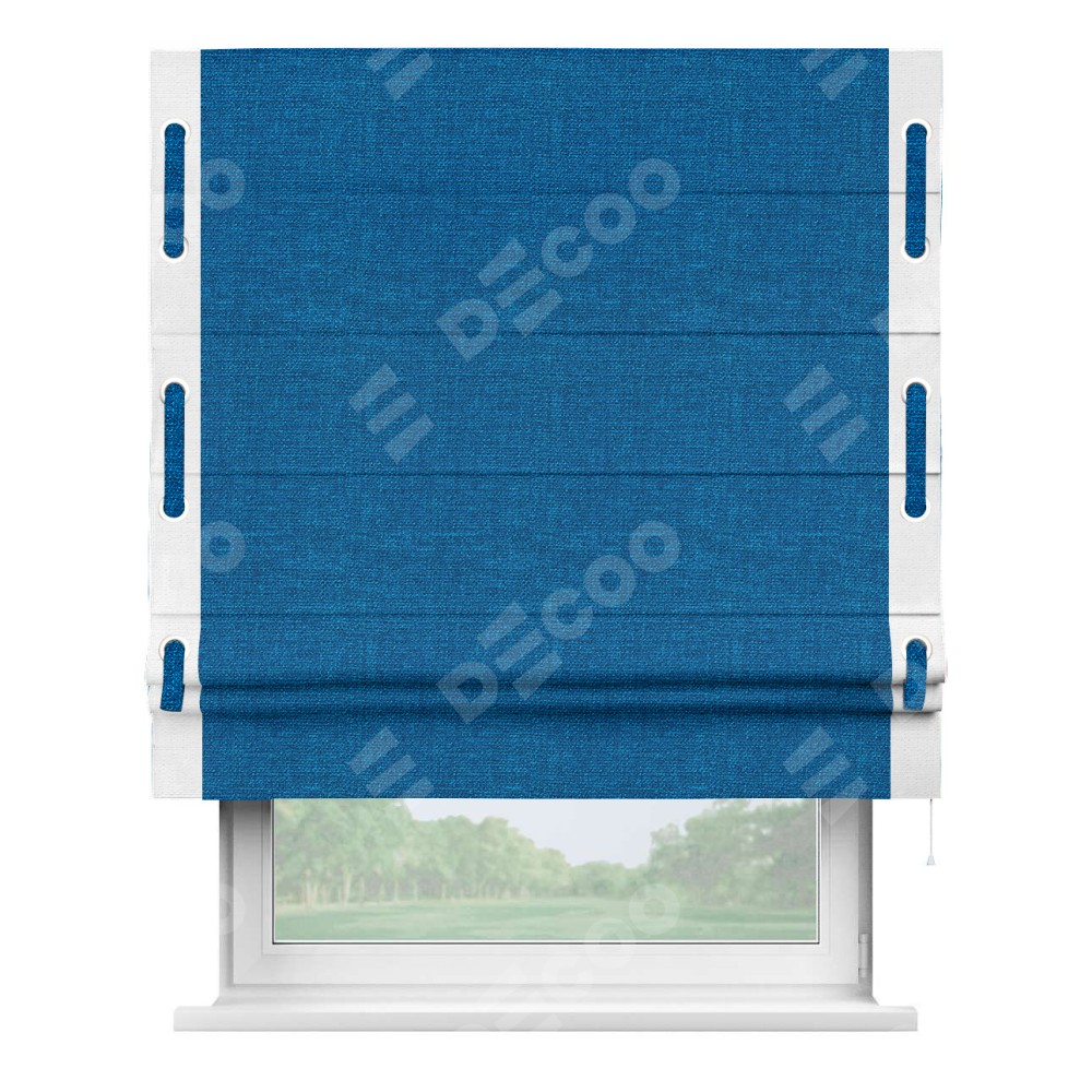 Римская штора производителя «Cortin», используется для проёма, пошита из ткани лён синий, артикул 63742. Отделка шторы кантом «Стрим Дуо» на кантах расположены люверсы с пояском, ткань для канта используется из льна разной расцветки на выбор. Ткань для пояска обычно используется из основной ткани шторы, а так же можно сделать из любой расцветки по желанию. Имеет универсальный механизм и подходит для монтажа: на потолок, на стену и в нишу.