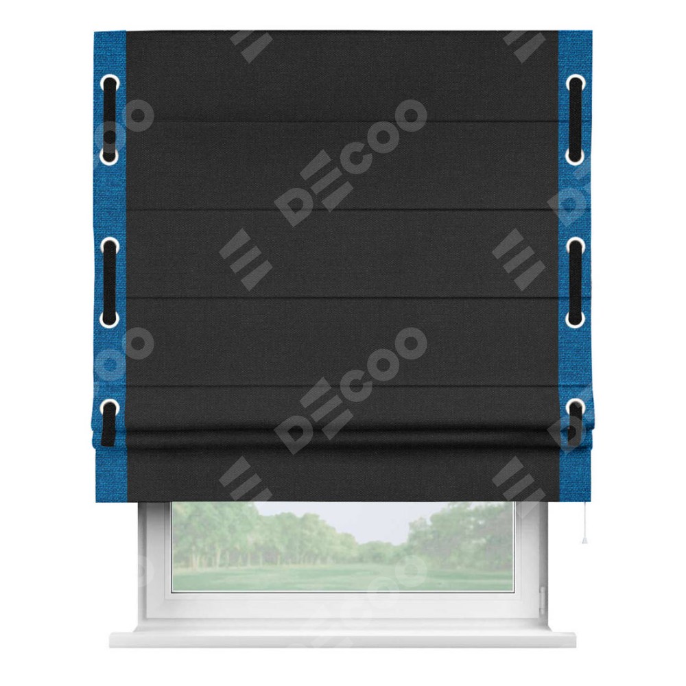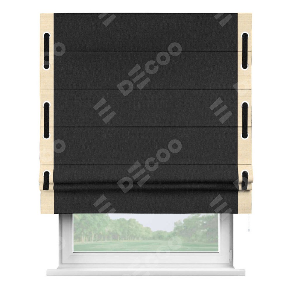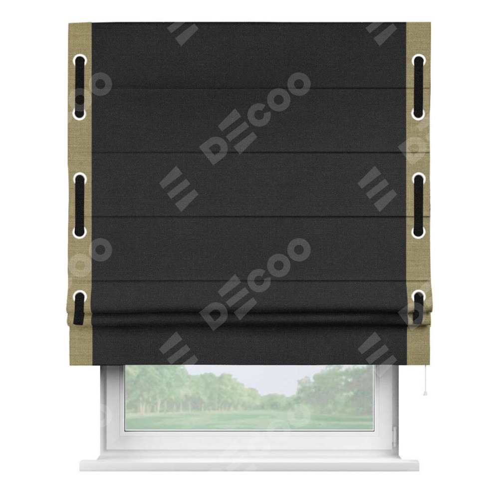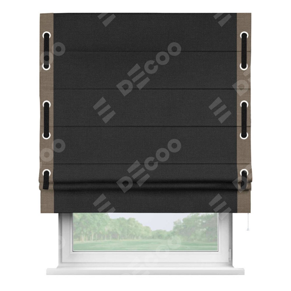 Римская штора производителя «Cortin», используется для проёма, пошита из ткани лён черный, артикул 85927. Отделка шторы кантом «Стрим Дуо» на кантах расположены люверсы с пояском, ткань для канта используется из льна разной расцветки на выбор. Ткань для пояска обычно используется из основной ткани шторы, а так же можно сделать из любой расцветки по желанию. Имеет универсальный механизм и подходит для монтажа: на потолок, на стену и в нишу.