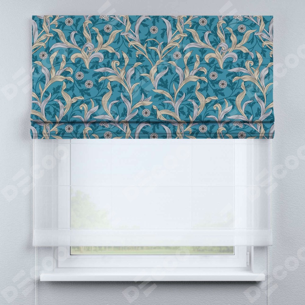 Римская штора день-ночь производителя «Cortin», используется для проёма, пошита из двух полотен, с лицевой блэкаут с нанесением сублимационной печати «Винтажные листья», вторая ткань тюль (по стандарту комплектуется тюль белого цвета артикул V-01). Имеет универсальный механизм и подходит для монтажа: на потолок, на стену и в нишу.