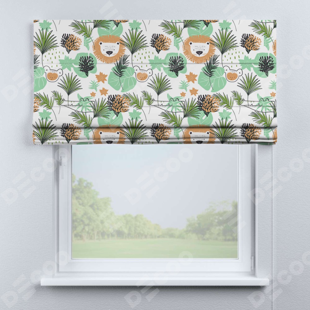 Римская штора производителя «Cortin», используется для проёма, пошита из ткани блэкаут с нанесением сублимационной печати «Животные из джунглей». Имеет универсальный механизм и подходит для монтажа: на потолок, на стену и в нишу.