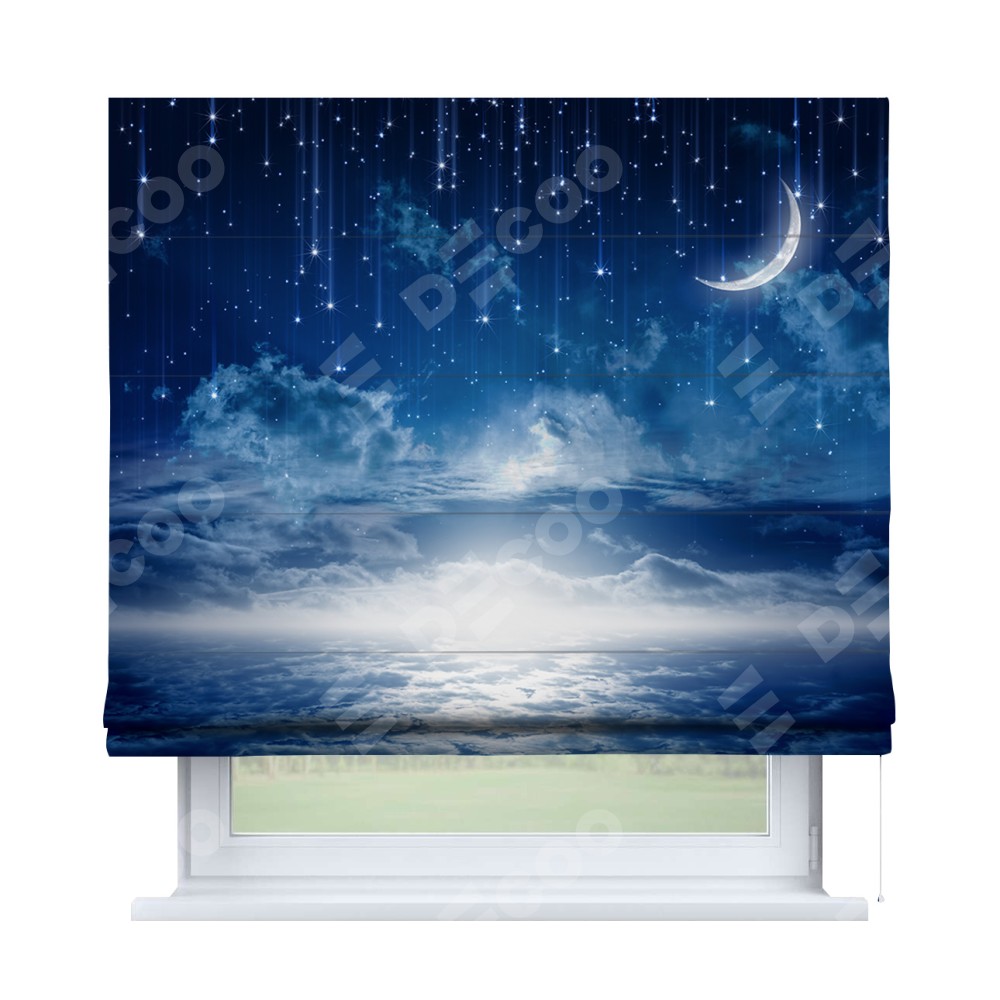 Римская штора производителя «Cortin», используется для проёма, пошита из ткани блэкаут с нанесением сублимационной печати «Ночное небо». Имеет универсальный механизм и подходит для монтажа: на потолок, на стену и в нишу.