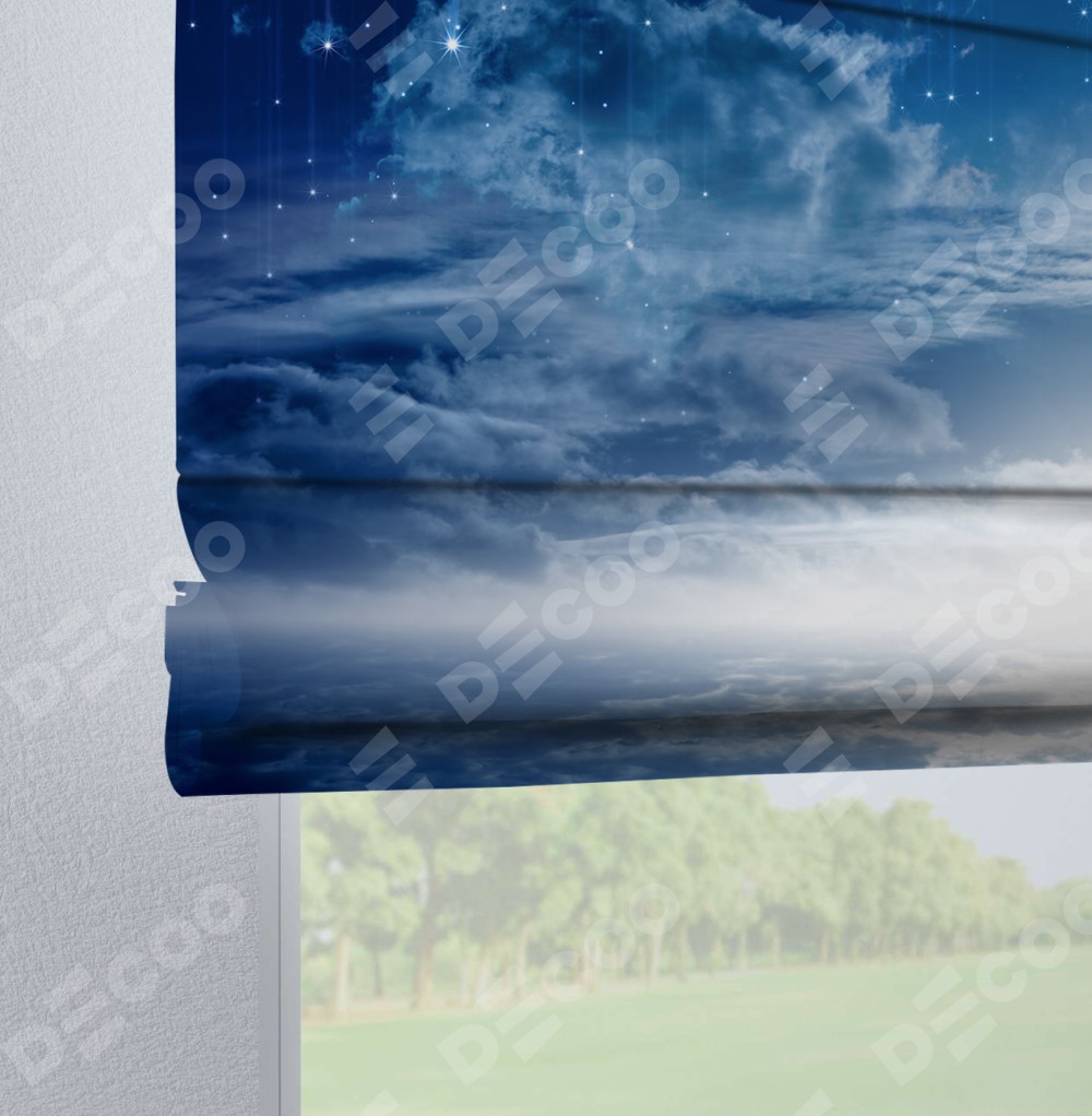 Римская штора производителя «Cortin», используется для проёма, пошита из ткани блэкаут с нанесением сублимационной печати «Ночное небо». Данная модель пошита на петлях, комплектуется на выбор круглым карнизом и подходит для монтажа на стену. Римская штора на петлях имеет простую систему регулировки высоты, отличительным преимуществом данной модели является простой способ монтажа. Достаточно повесить ее на трубу и штора готова!