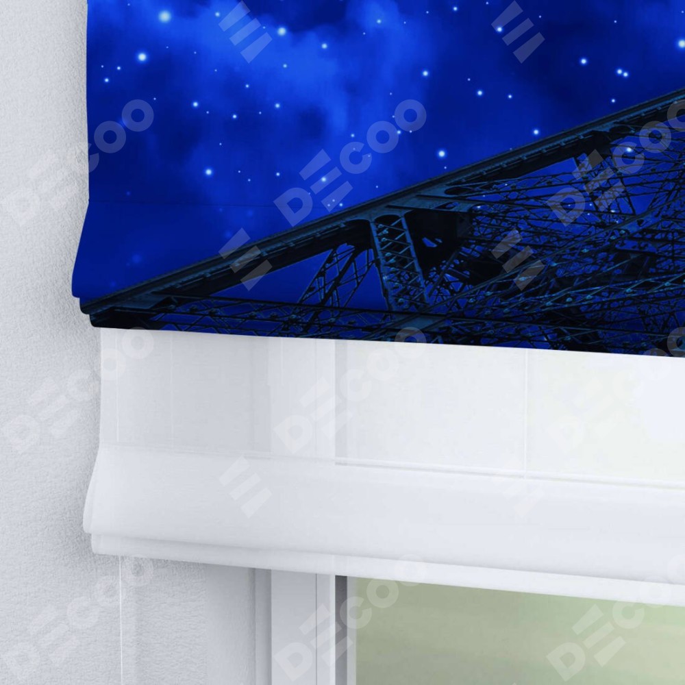 Римская штора день-ночь производителя «Cortin», используется для проёма, пошита из двух полотен, с лицевой блэкаут с нанесением сублимационной печати «Ночь в Париже», вторая ткань тюль (по стандарту комплектуется тюль белого цвета артикул V-01). Имеет универсальный механизм и подходит для монтажа: на потолок, на стену и в нишу.