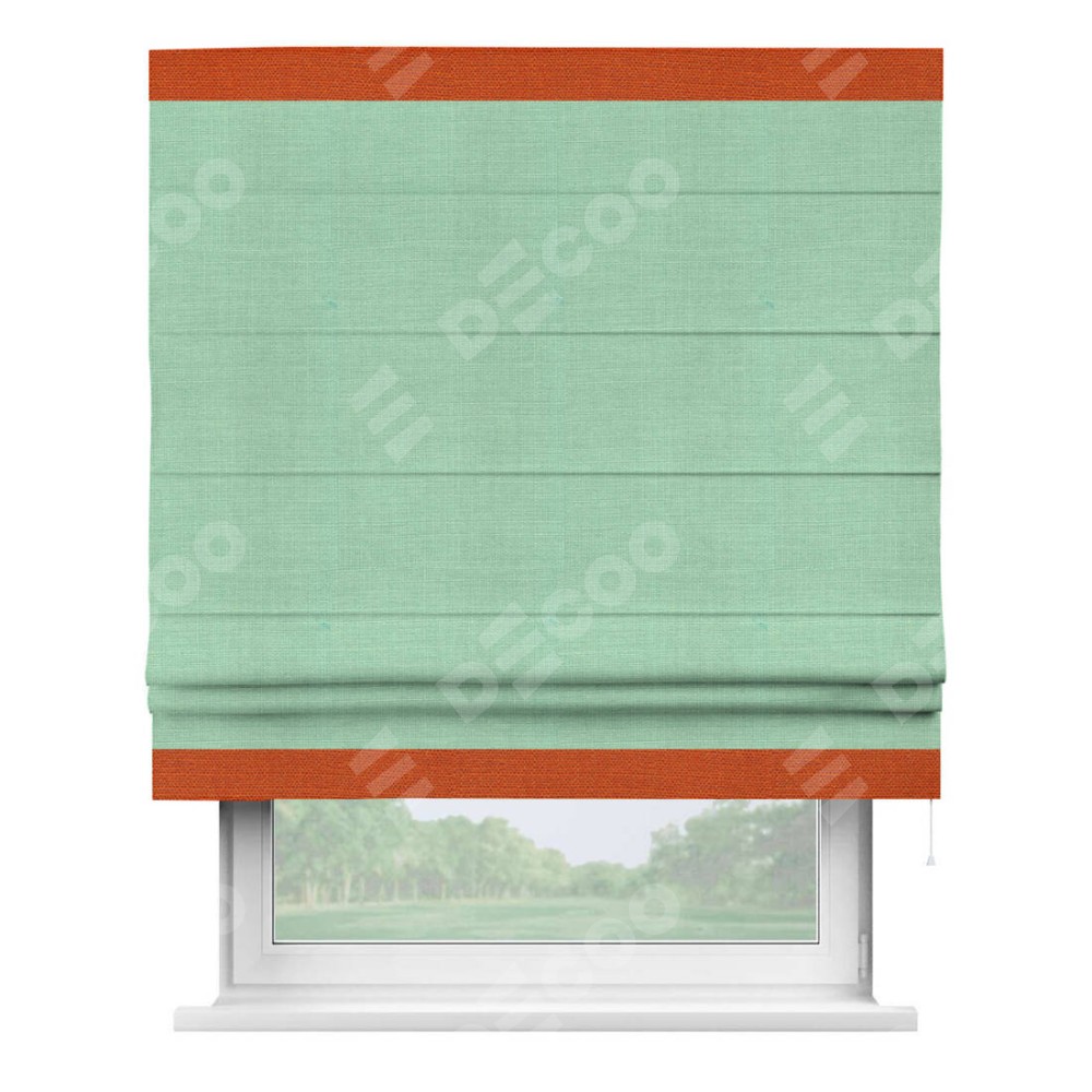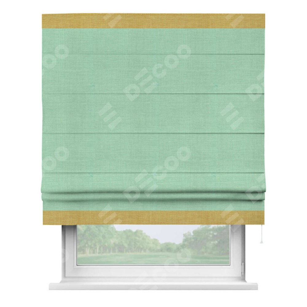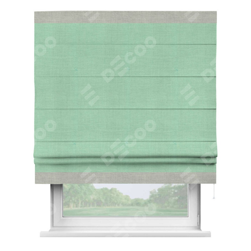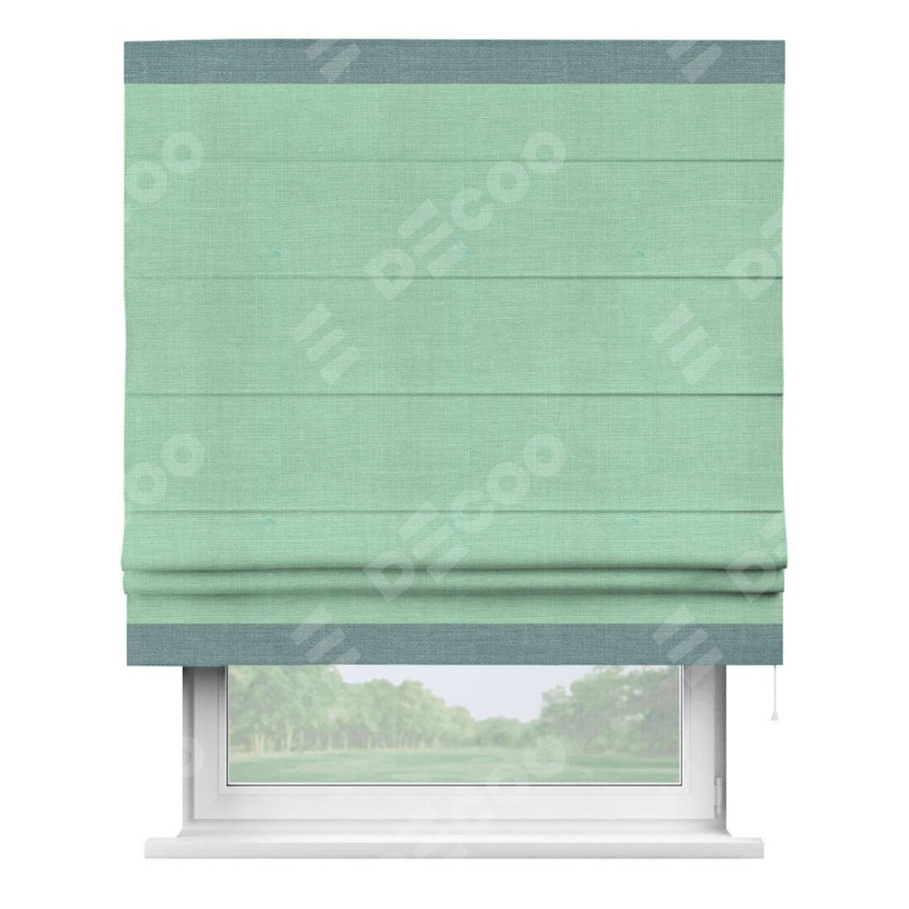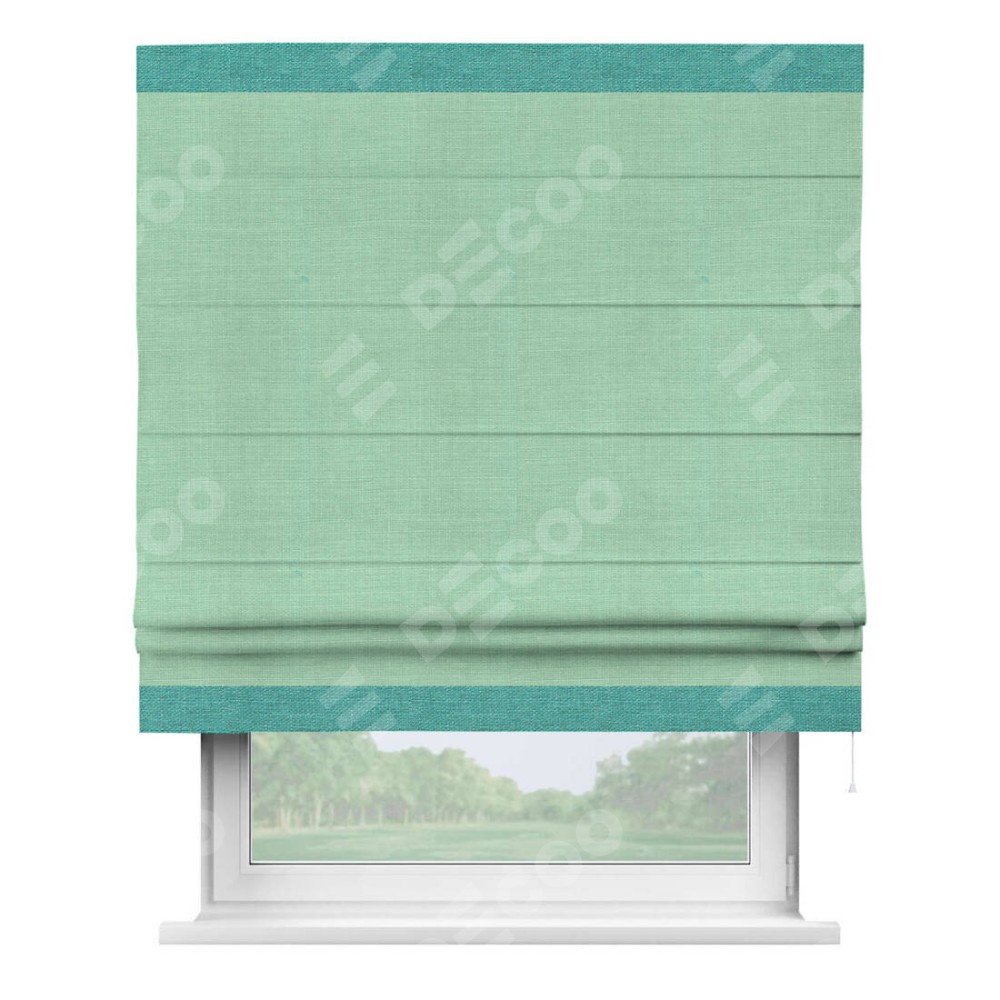 Римская штора производителя «Cortin», используется для проёма, пошита из ткани лён светло-бирюзовый, артикул 74737. Отделка шторы кантом «Горизонт», ткань для канта используется из льна разной расцветки на выбор. Имеет универсальный механизм и подходит для монтажа: на потолок, на стену и в нишу.