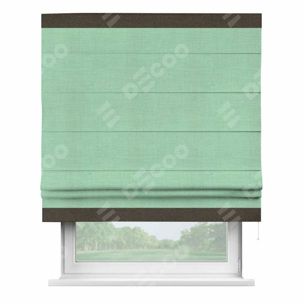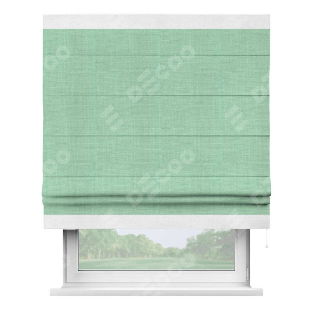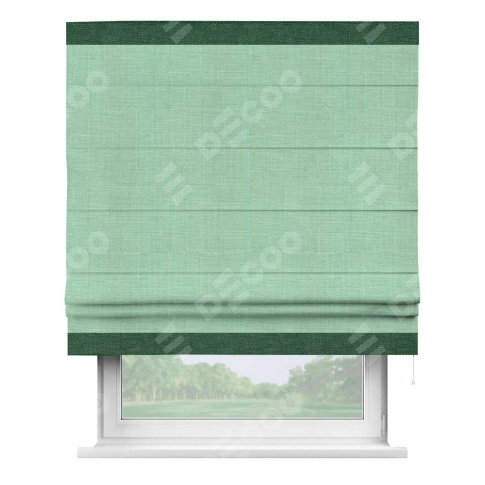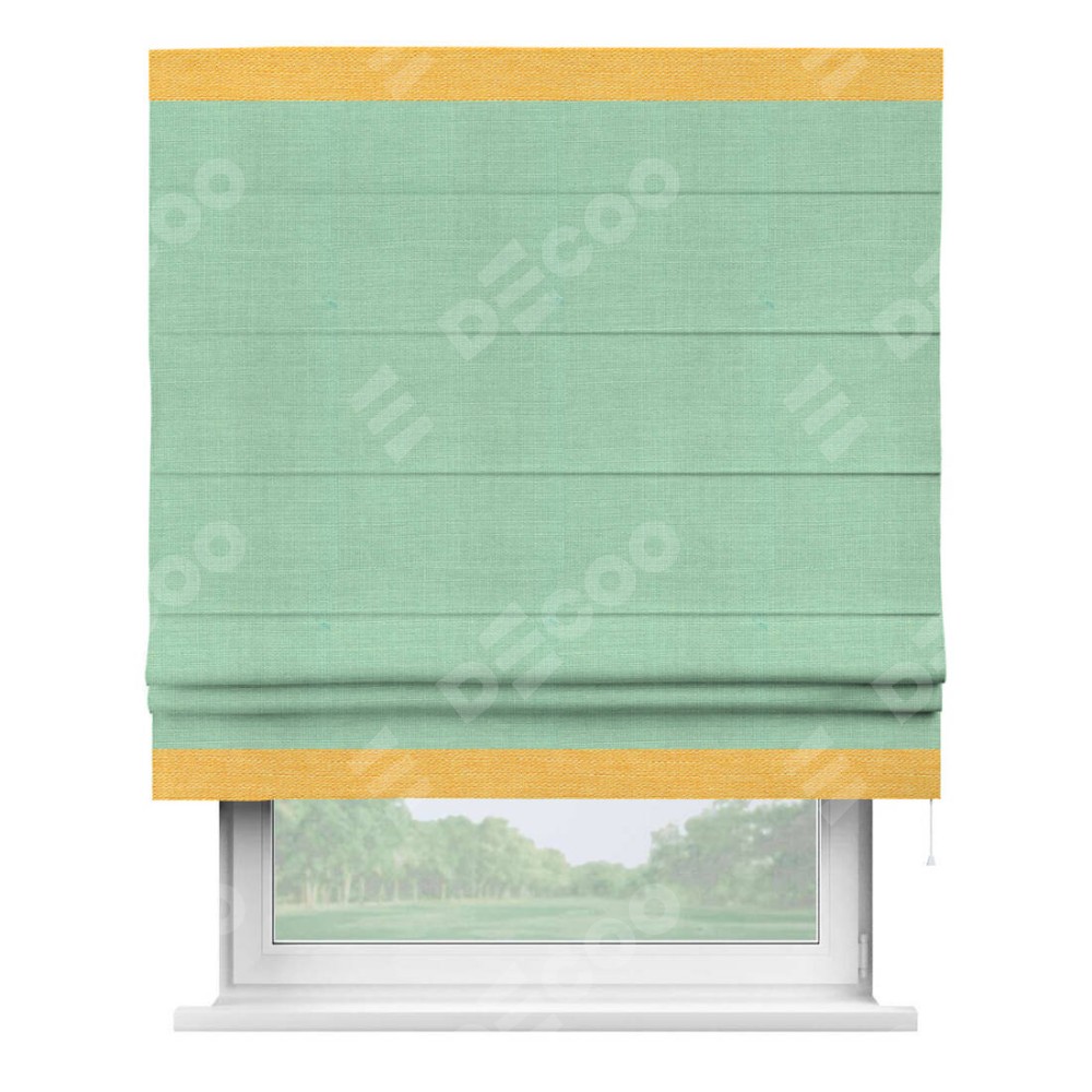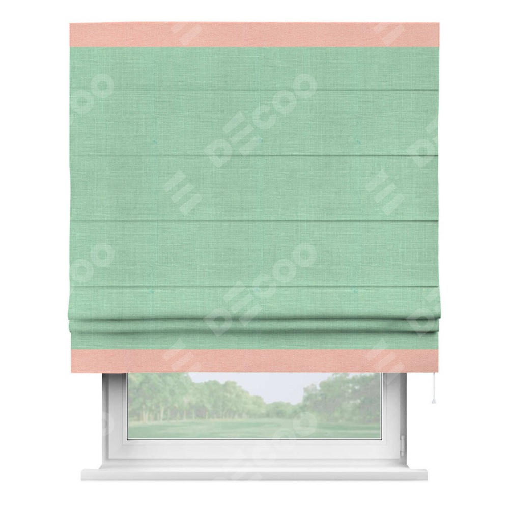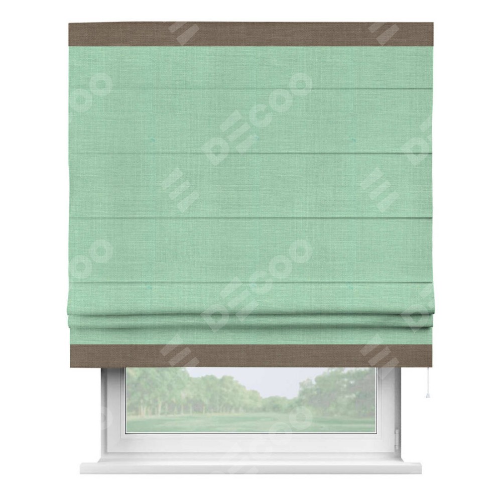 Римская штора производителя «Cortin», используется для проёма, пошита из ткани лён светло-бирюзовый, артикул 74737. Отделка шторы кантом «Горизонт», ткань для канта используется из льна разной расцветки на выбор. Имеет универсальный механизм и подходит для монтажа: на потолок, на стену и в нишу.