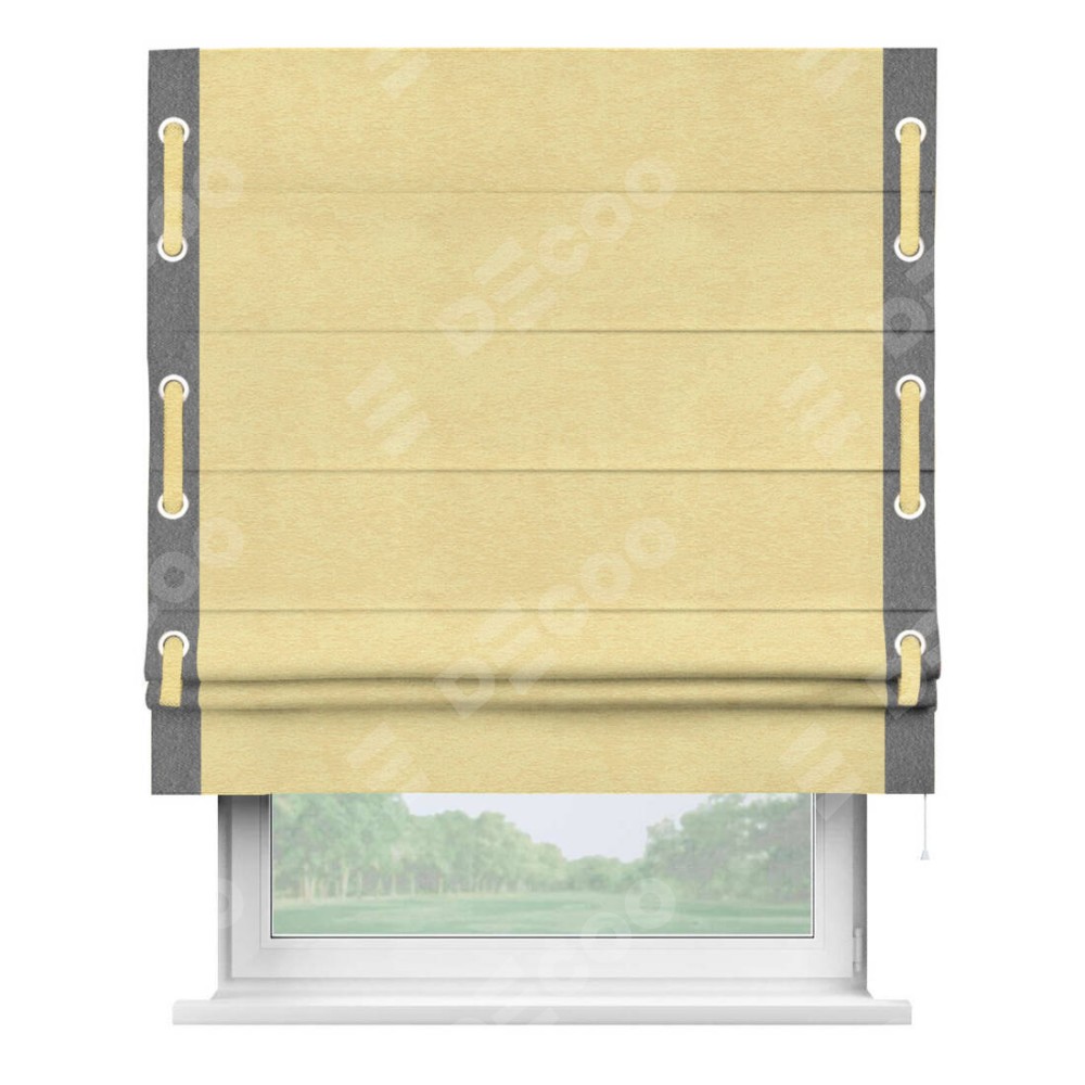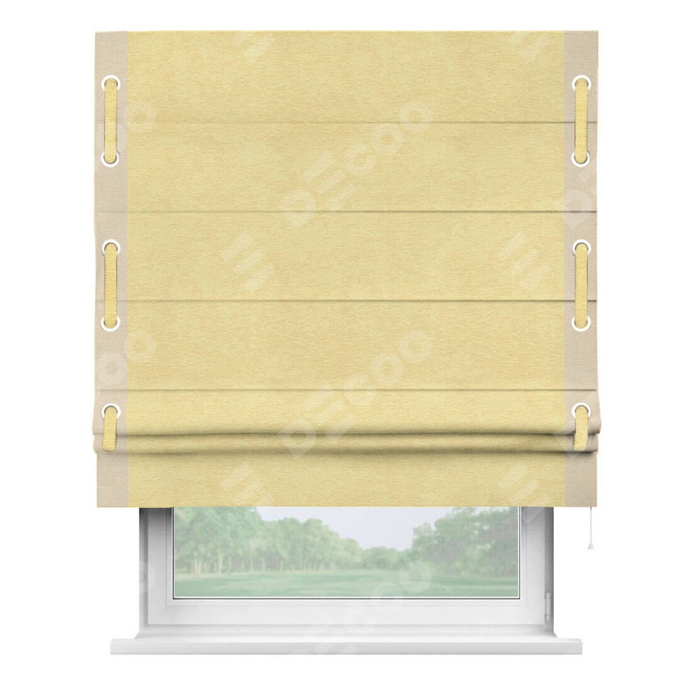 Римская штора производителя «Cortin», используется для проёма, пошита из ткани софт однотонный золотой, артикул 42934. Отделка шторы кантом «Стрим Дуо» на кантах расположены люверсы с пояском, ткань для канта используется из софта разной расцветки на выбор. Ткань для пояска обычно используется из основной ткани шторы, а так же можно сделать из любой расцветки по желанию. Имеет универсальный механизм и подходит для монтажа: на потолок, на стену и в нишу.