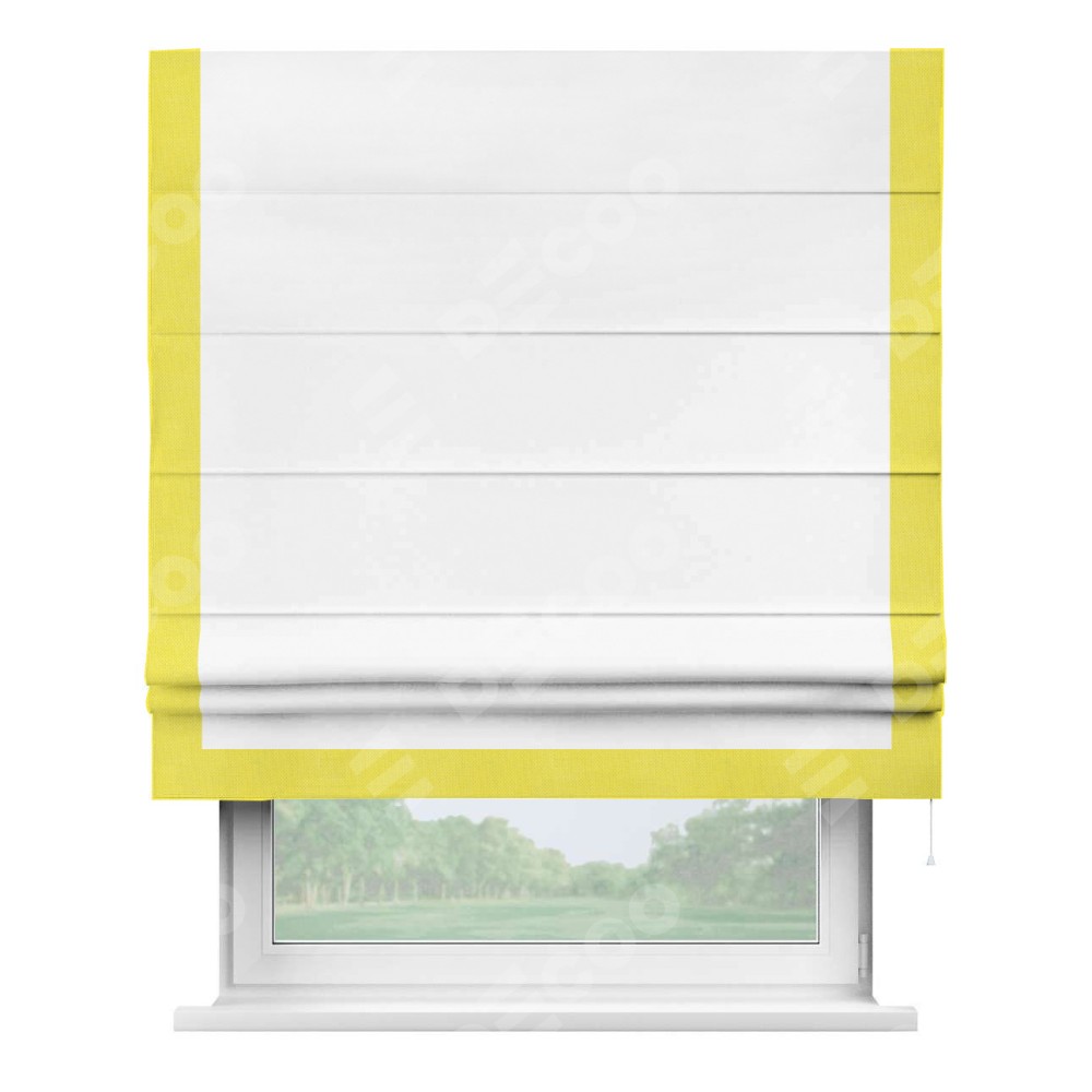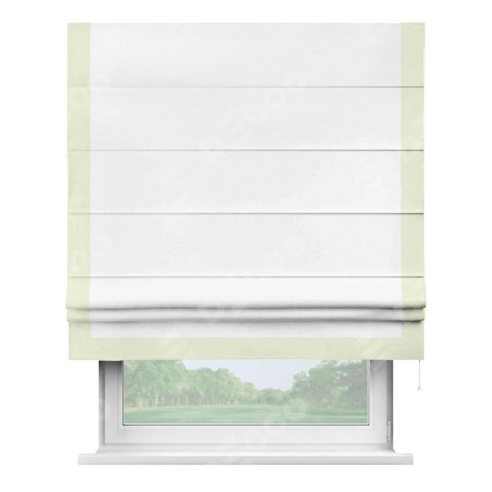 Римская штора производителя «Cortin», используется для проёма, пошита из ткани вельвет белоснежный, артикул ткани 19192. Отделка шторы кантом «Виктория», ткань для канта используется из вельвета разной расцветки на выбор. Имеет универсальный механизм и подходит для монтажа: на потолок, на стену и в нишу.