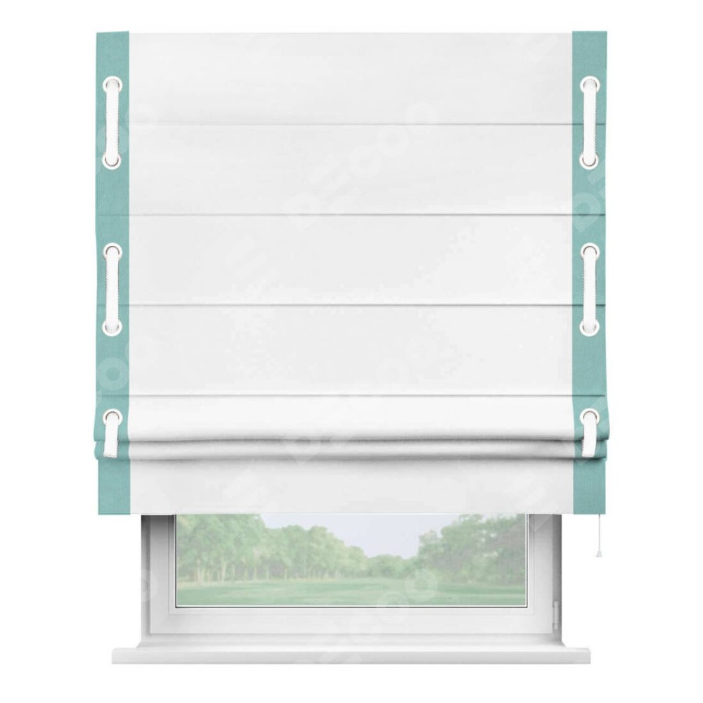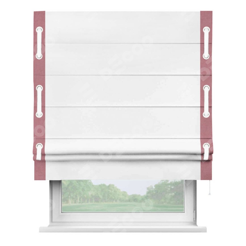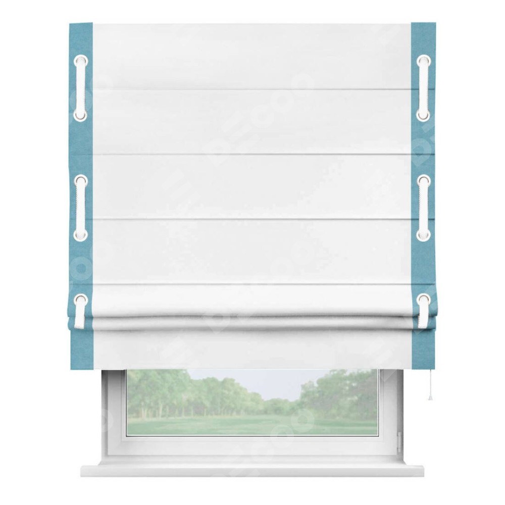 Римская штора производителя «Cortin», используется для проёма, пошита из ткани вельвет белоснежный, артикул ткани 19192. Отделка шторы кантом «Стрим Дуо» на кантах расположены люверсы с пояском, ткань для канта используется из вельвета разной расцветки на выбор. Ткань для пояска обычно используется из основной ткани шторы, а так же можно сделать из любой расцветки по желанию. Имеет универсальный механизм и подходит для монтажа: на потолок, на стену и в нишу.