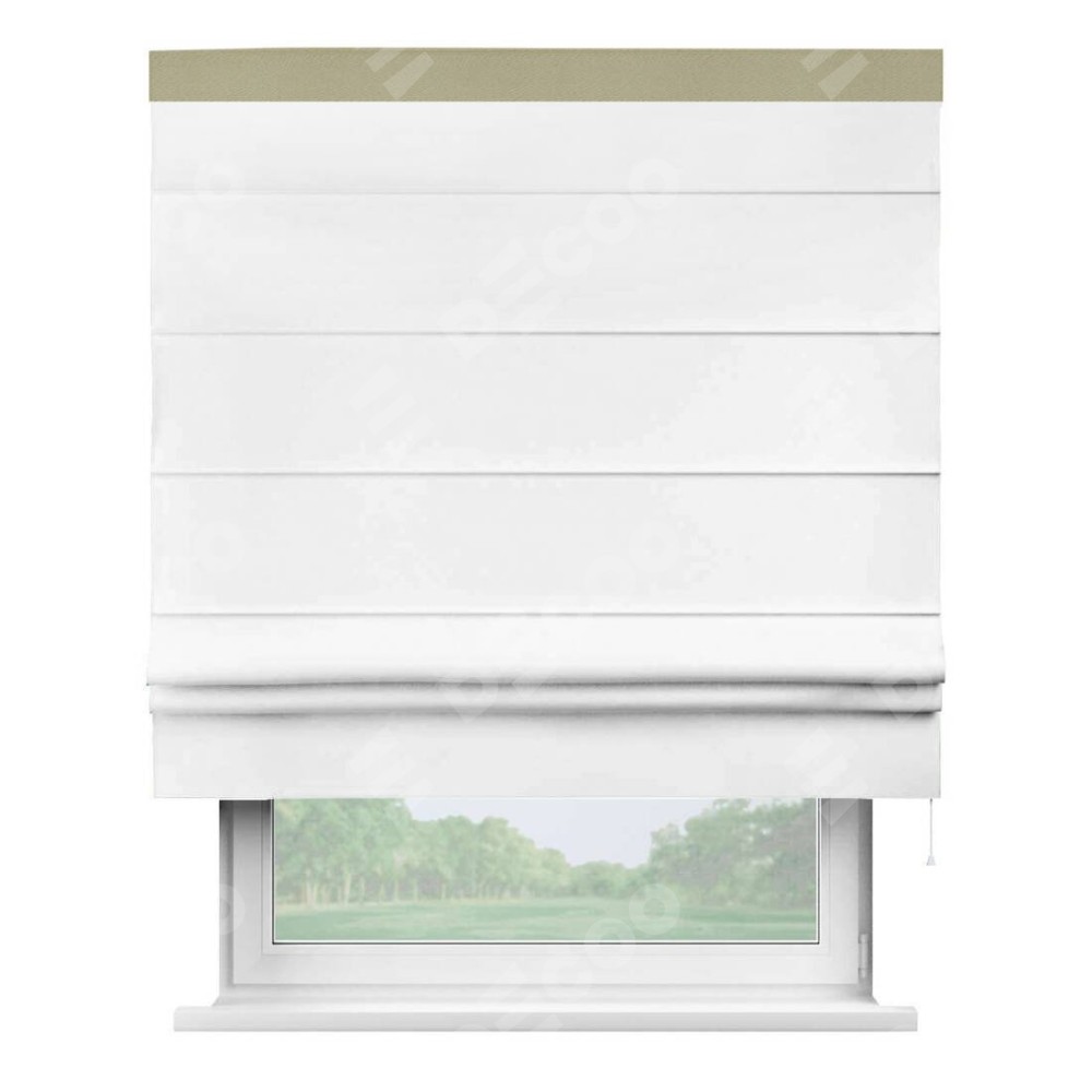Римская штора производителя «Cortin», используется для проёма, пошита из ткани однотонная белоснежная, артикул ткани 41217. Отделка шторы кантом «Кинг», ткань для канта используется из блэкаута однотонного разной расцветки на выбор. Имеет универсальный механизм и подходит для монтажа: на потолок, на стену и в нишу.