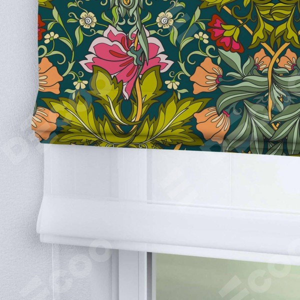 Римская штора день-ночь производителя «Cortin», используется для проёма, пошита из двух полотен, с лицевой блэкаут с нанесением сублимационной печати «Цветок морриса», вторая ткань тюль (по стандарту комплектуется тюль белого цвета артикул V-01). Имеет универсальный механизм и подходит для монтажа: на потолок, на стену и в нишу.