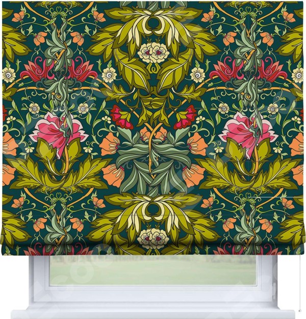 Римская штора производителя «Cortin», используется для проёма, пошита из ткани блэкаут с нанесением сублимационной печати «Цветок морриса». Имеет универсальный механизм и подходит для монтажа: на потолок, на стену и в нишу.