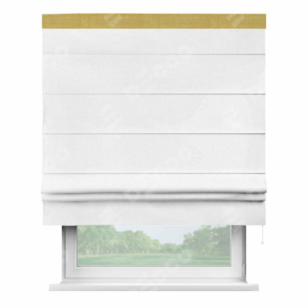 Римская штора производителя «Cortin», используется для проёма, пошита из ткани лён белый, артикул 7439. Отделка шторы кантом «Кинг», ткань для канта используется из льна разной расцветки на выбор. Имеет универсальный механизм и подходит для монтажа: на потолок, на стену и в нишу.
