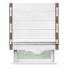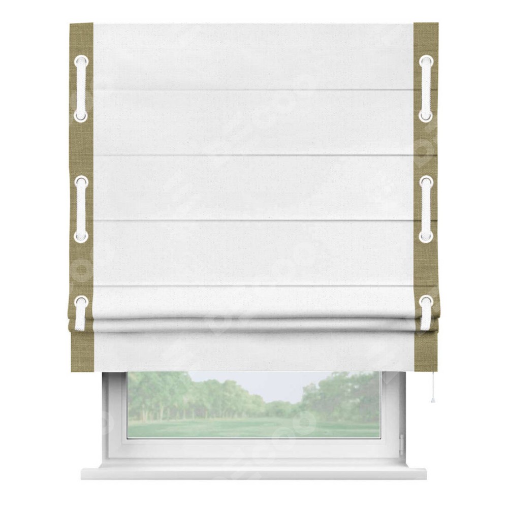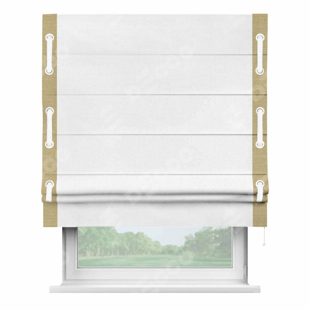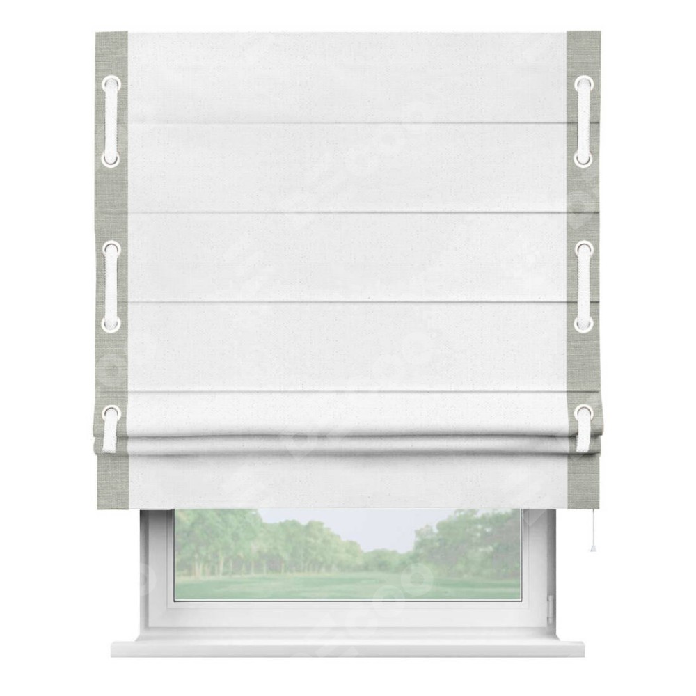 Римская штора производителя «Cortin», используется для проёма, пошита из ткани лён белый, артикул 7439. Отделка шторы кантом «Стрим Дуо» на кантах расположены люверсы с пояском, ткань для канта используется из льна разной расцветки на выбор. Ткань для пояска обычно используется из основной ткани шторы, а так же можно сделать из любой расцветки по желанию. Имеет универсальный механизм и подходит для монтажа: на потолок, на стену и в нишу.