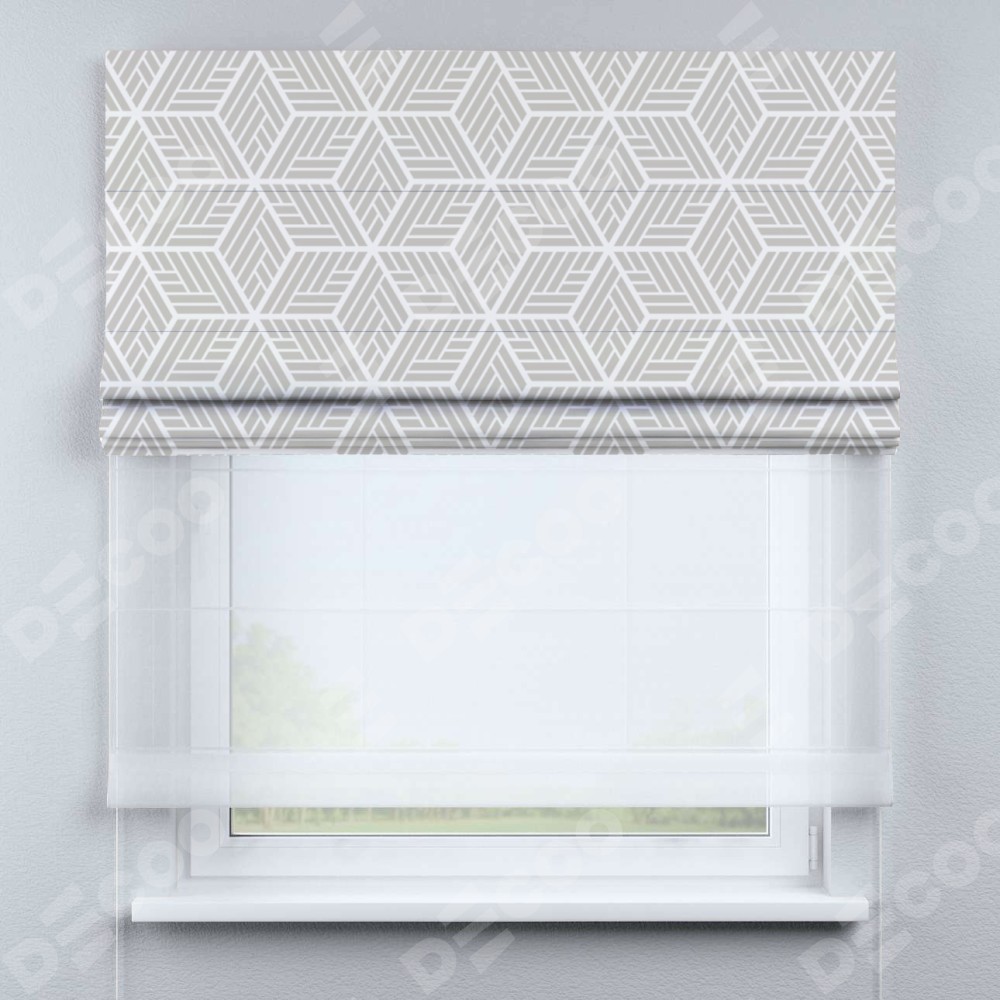 Римская штора день-ночь производителя «Cortin», используется для проёма, пошита из двух полотен, с лицевой блэкаут с нанесением сублимационной печати «Элемент», вторая ткань тюль (по стандарту комплектуется тюль белого цвета артикул V-01). Имеет универсальный механизм и подходит для монтажа: на потолок, на стену и в нишу.