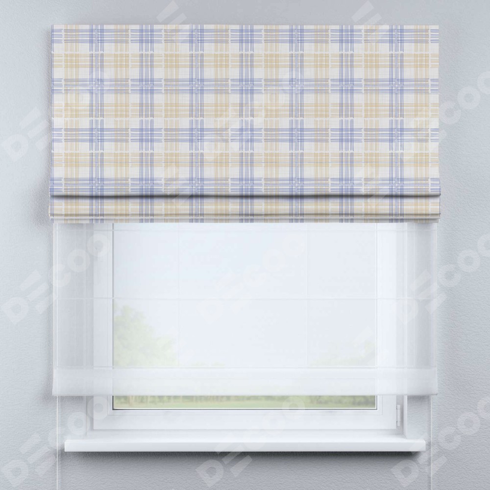 Римская штора день-ночь производителя «Cortin», используется для проёма, пошита из двух полотен, с лицевой блэкаут с нанесением сублимационной печати «Клетки кантри», вторая ткань тюль (по стандарту комплектуется тюль белого цвета артикул V-01). Имеет универсальный механизм и подходит для монтажа: на потолок, на стену и в нишу.