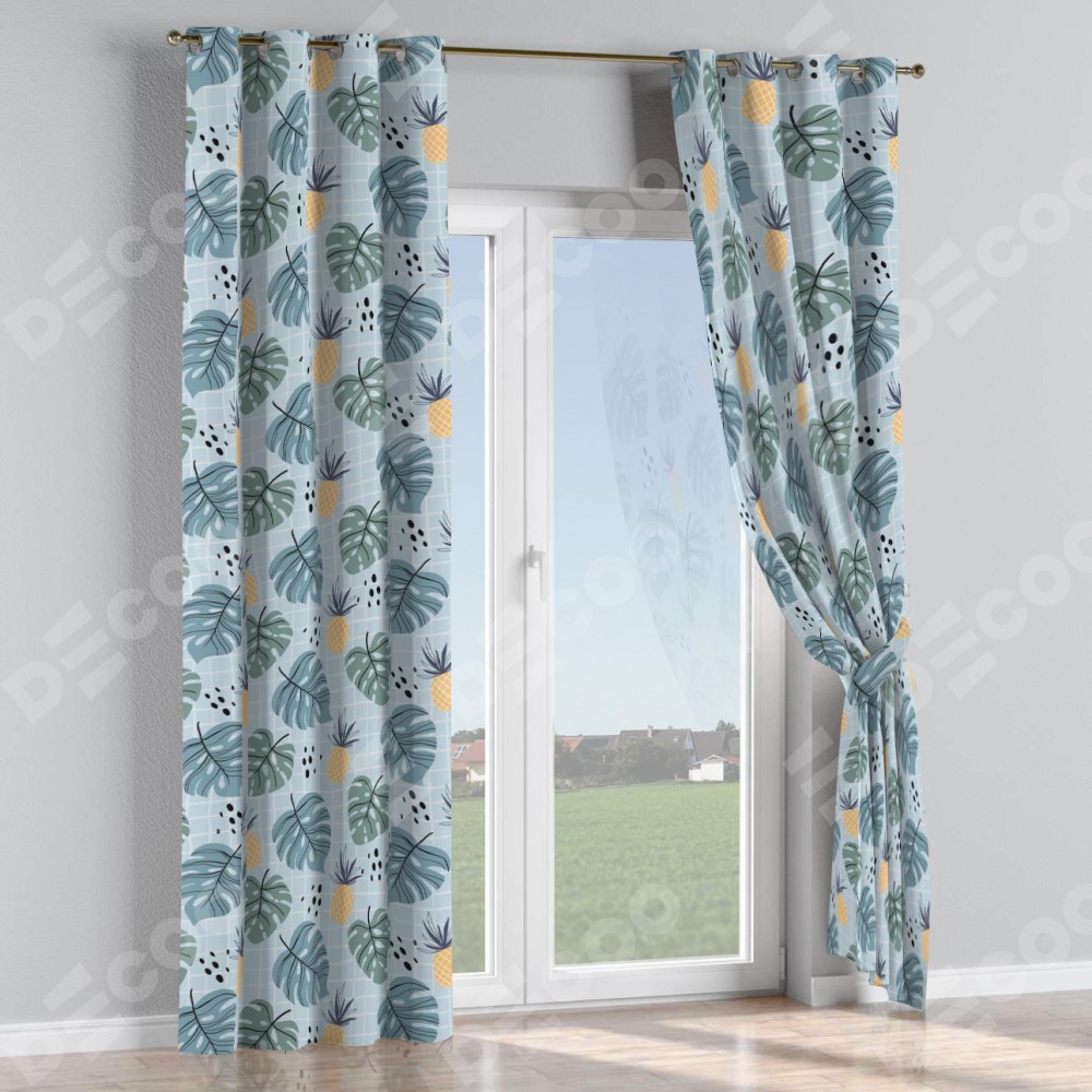 Комплект прямых штор, от производителя «Cortin», пошиты из ткани блэкаут с нанесением сублимационной печати «Ананасы и листья монстеры». Данная модель пошита на люверсах, комплектуется на выбор круглым карнизом и подходит для монтажа на стену или потолок. Прямые шторы на люверсах шьются по стандарту с коэффициентом 1/2 (на 100 см. ширины проёма 200 см. ширины ткани), отличительным преимуществом данной модели является простой способ монтажа. Достаточно повесить ее на трубу и штора готова!