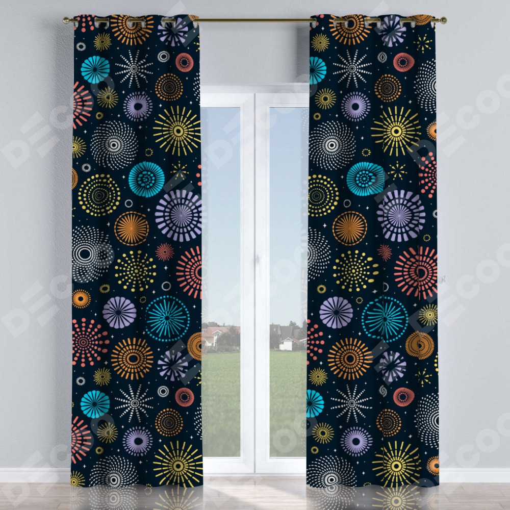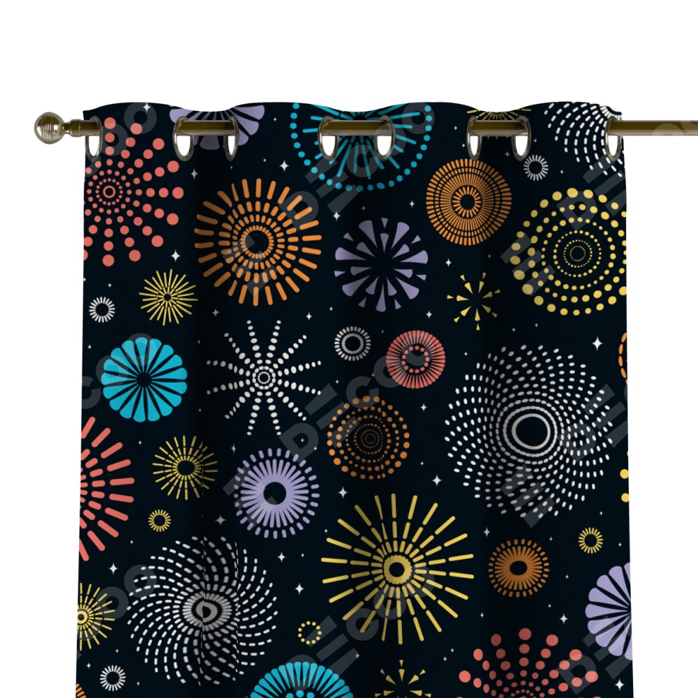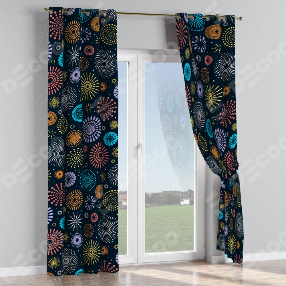 Комплект прямых штор, от производителя «Cortin», пошиты из ткани блэкаут с нанесением сублимационной печати «Праздничный фейерверк». Данная модель пошита на люверсах, комплектуется на выбор круглым карнизом и подходит для монтажа на стену или потолок. Прямые шторы на люверсах шьются по стандарту с коэффициентом 1/2 (на 100 см. ширины проёма 200 см. ширины ткани), отличительным преимуществом данной модели является простой способ монтажа. Достаточно повесить ее на трубу и штора готова!