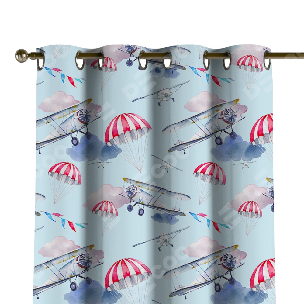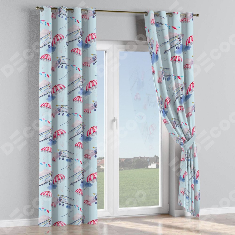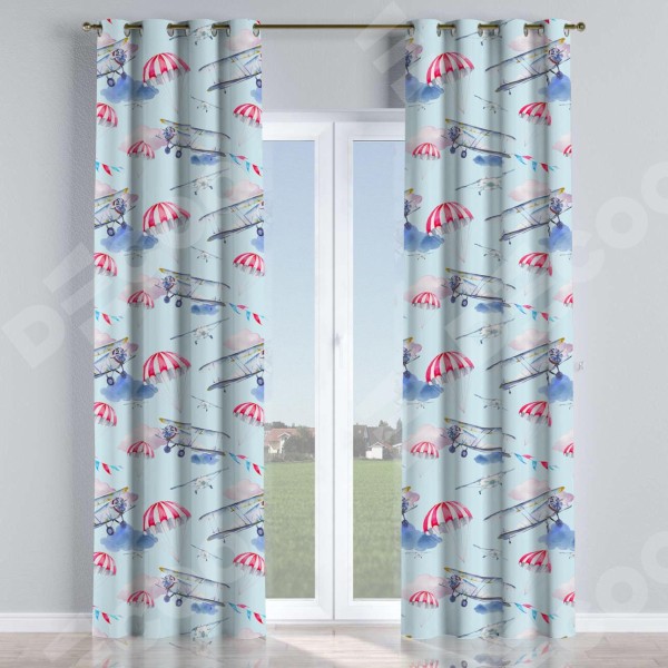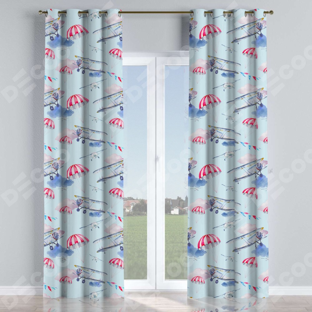 Комплект прямых штор, от производителя «Cortin», пошиты из ткани блэкаут с нанесением сублимационной печати «Самолёт». Данная модель пошита на люверсах, комплектуется на выбор круглым карнизом и подходит для монтажа на стену или потолок. Прямые шторы на люверсах шьются по стандарту с коэффициентом 1/2 (на 100 см. ширины проёма 200 см. ширины ткани), отличительным преимуществом данной модели является простой способ монтажа. Достаточно повесить ее на трубу и штора готова!
