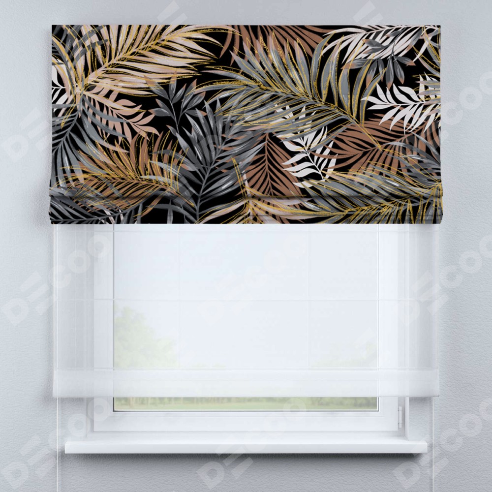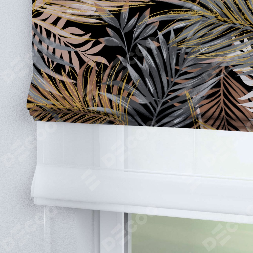 Римская штора день-ночь производителя «Cortin», используется для проёма, пошита из двух полотен, с лицевой блэкаут с нанесением сублимационной печати «Закат в тропиках», вторая ткань тюль (по стандарту комплектуется тюль белого цвета артикул V-01). Имеет универсальный механизм и подходит для монтажа: на потолок, на стену и в нишу.