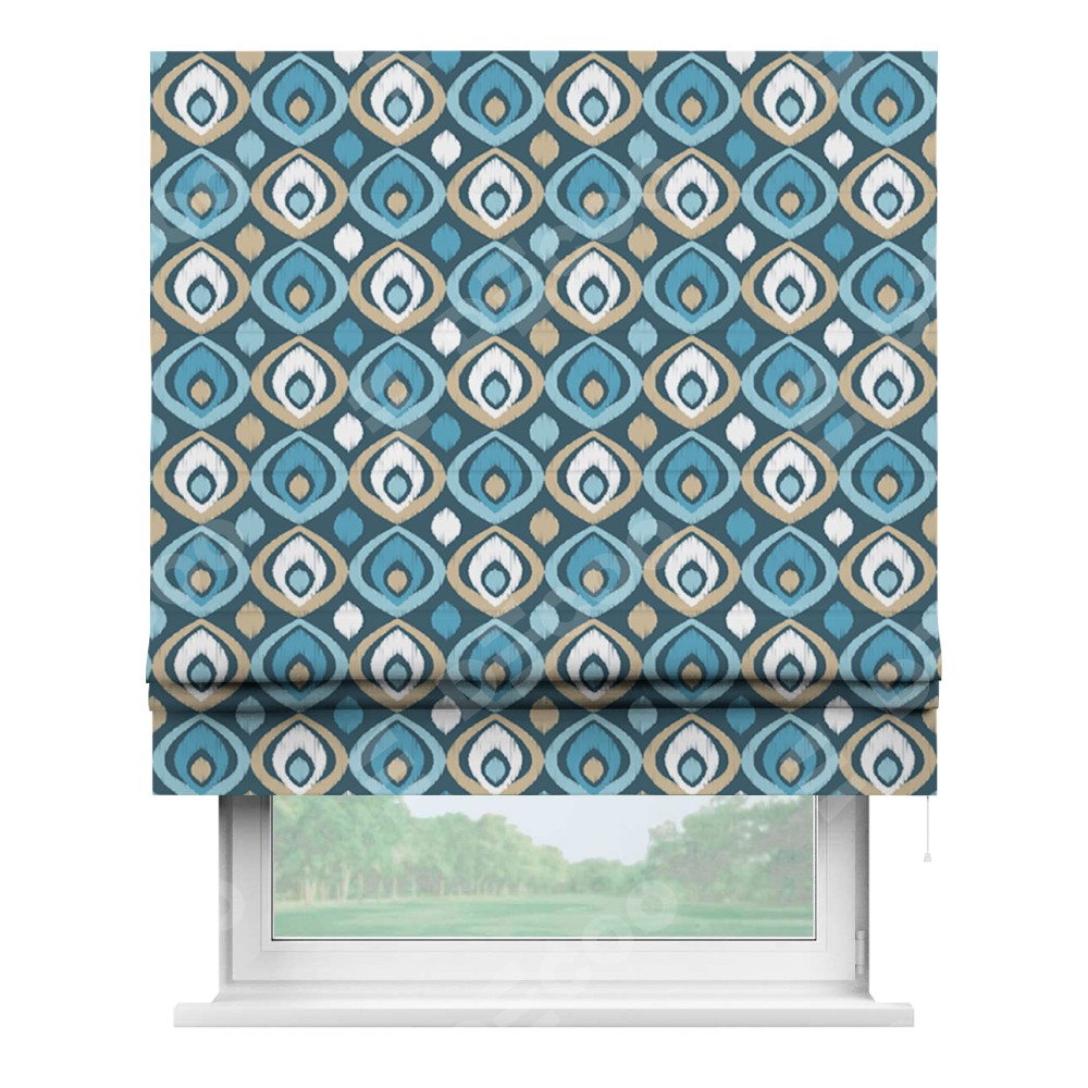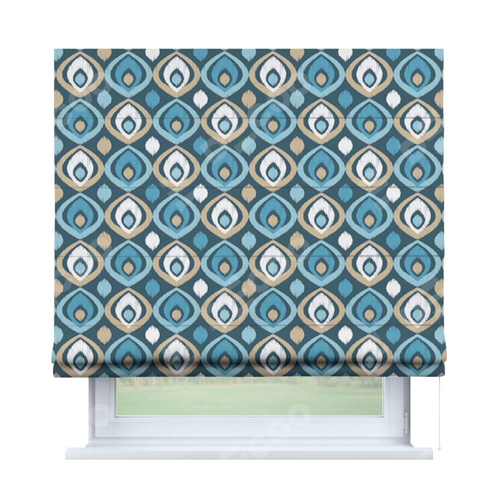 Римская штора производителя «Cortin», используется для проёма, пошита из ткани блэкаут с нанесением сублимационной печати «Икат орнамент». Имеет универсальный механизм и подходит для монтажа: на потолок, на стену и в нишу.